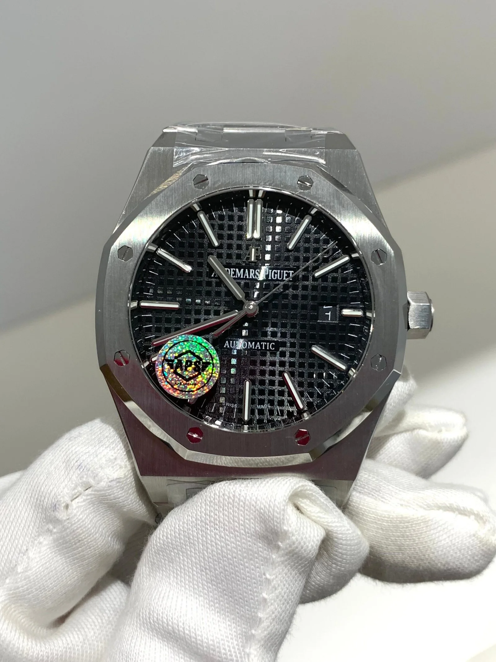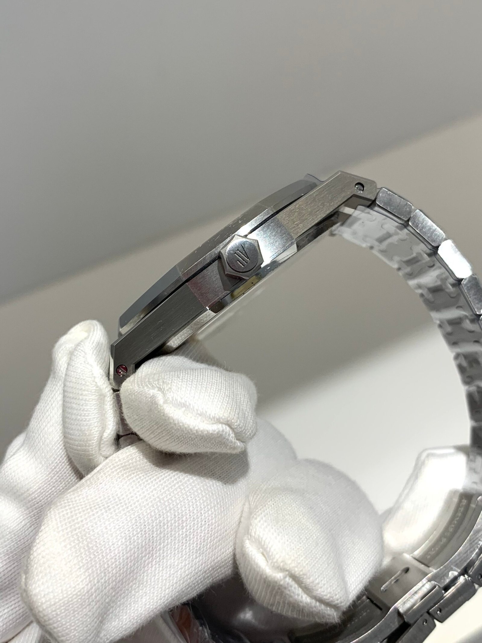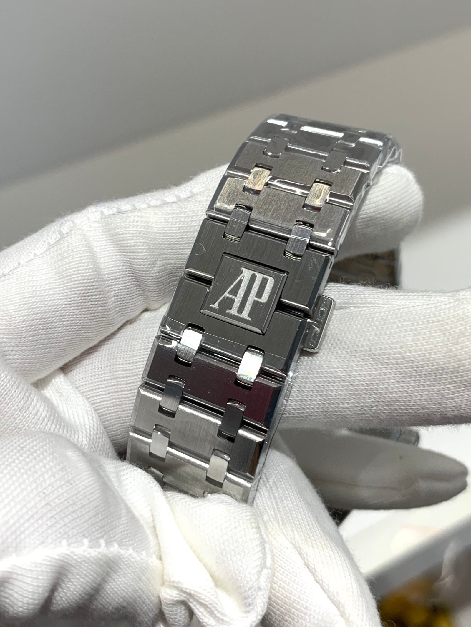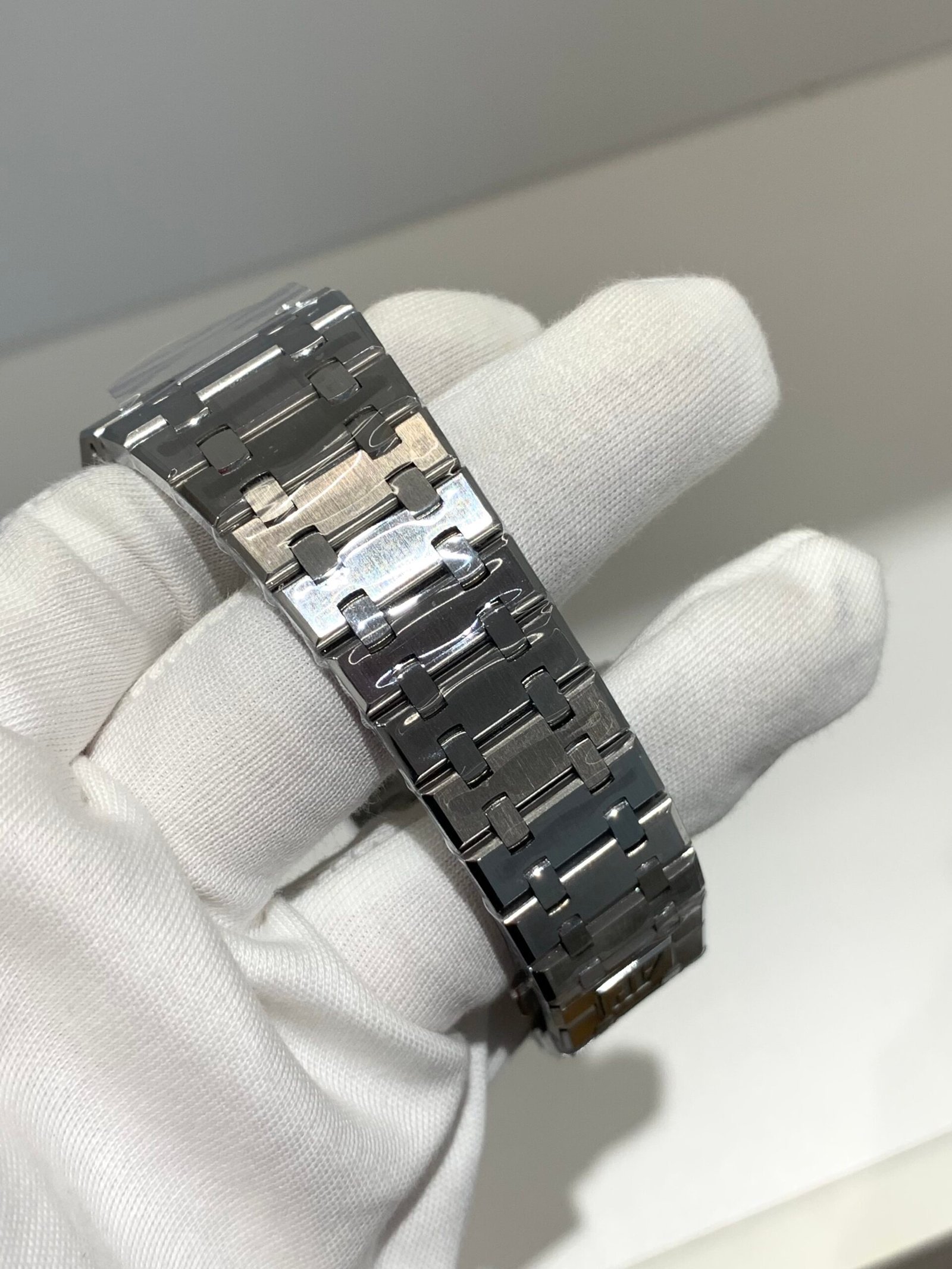Full 316L stainless steel construction with APSF’s signature factory-perfect finishing. The case features razor-sharp brushing on the lugs and mid-case, paired with high-polish beveled edges that catch light beautifully. The integrated Royal Oak bracelet has tight, even link gaps, smooth articulation, and a perfect taper—feeling identical to the genuine on the wrist, whether casual or dressed up.