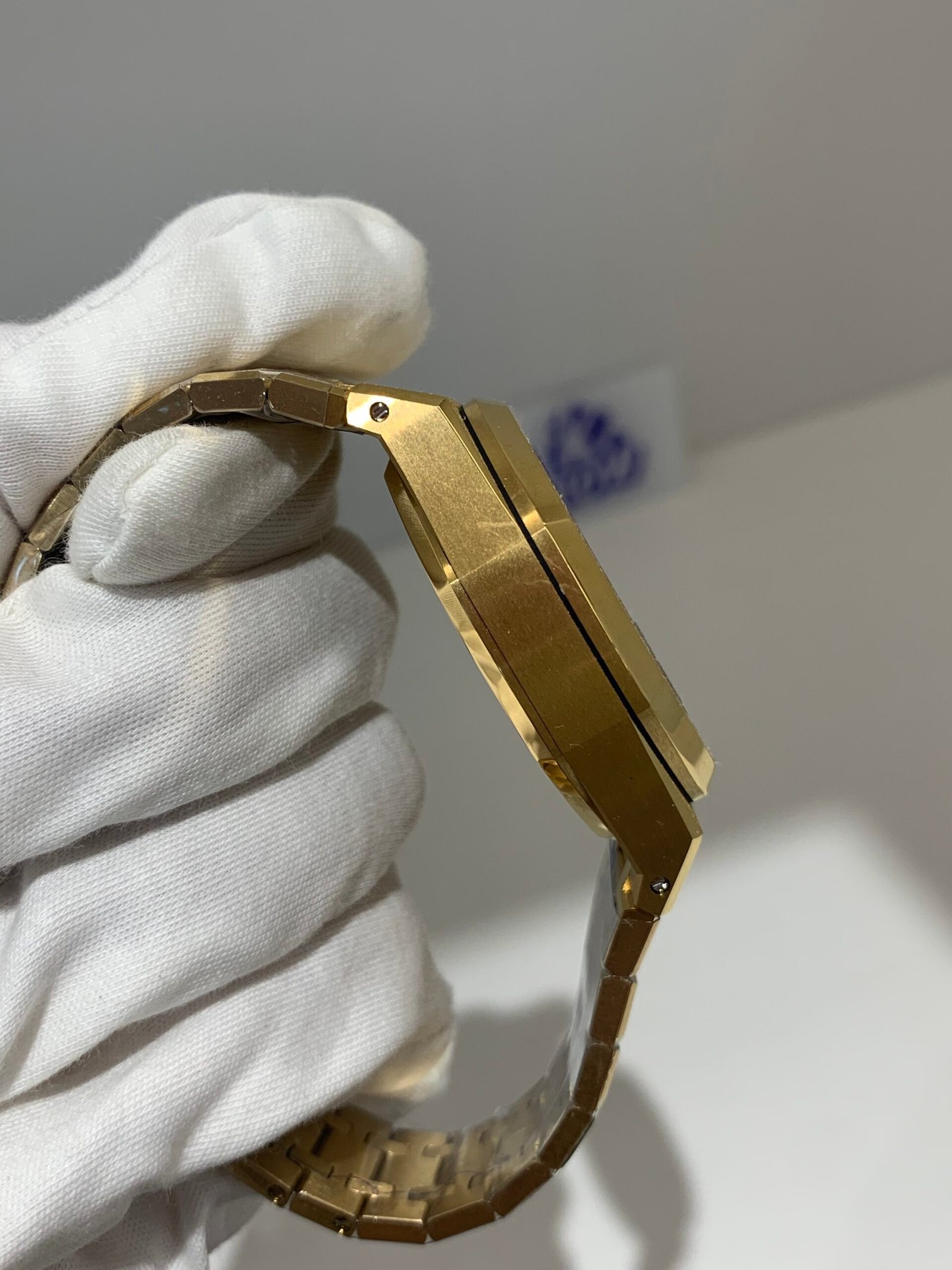 Vertical brushing on the surface with sharp, high-polish beveled edges—AP’s signature look, replicated flawlessly by APSF. The 8 hexagonal yellow gold screws are perfectly recessed, aligned, and polished to match genuine spec, securing the bezel with the timeless Royal Oak presenceAudemars Piguet.