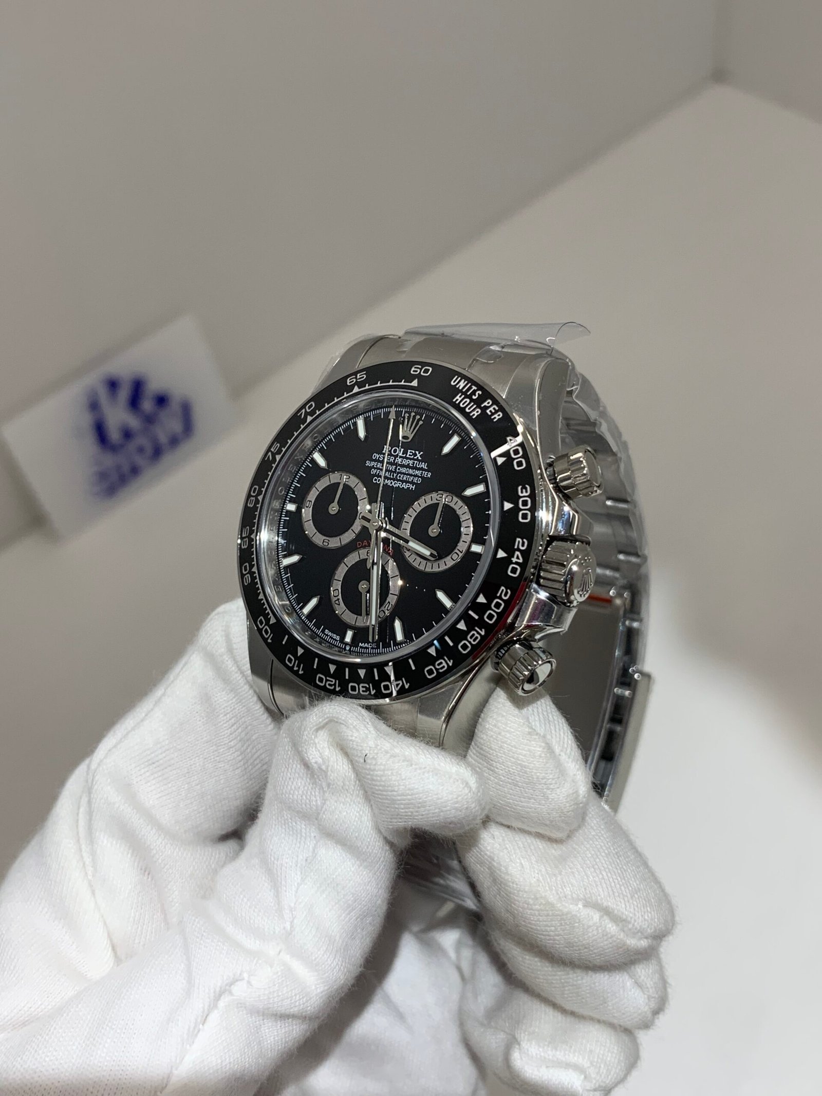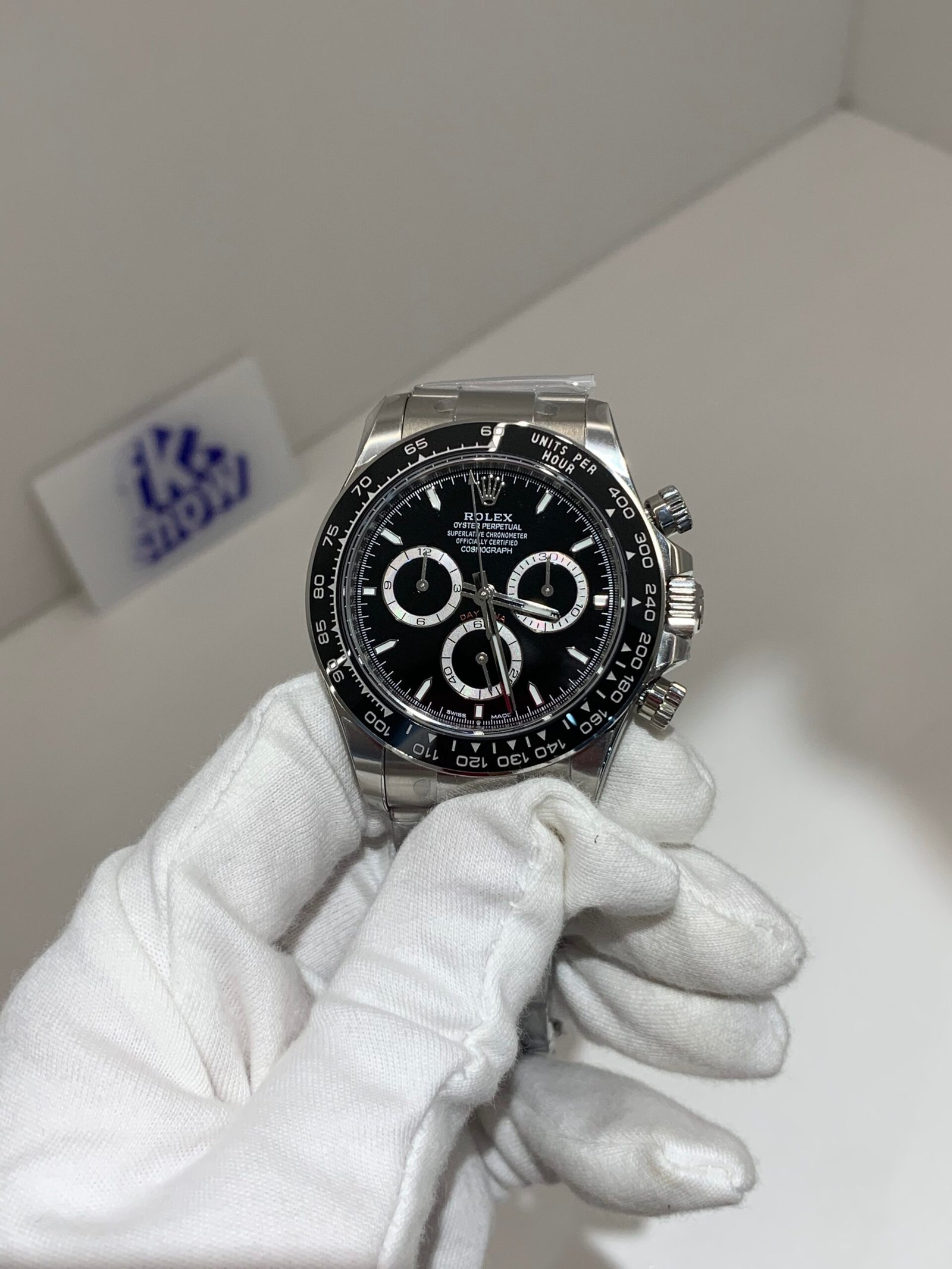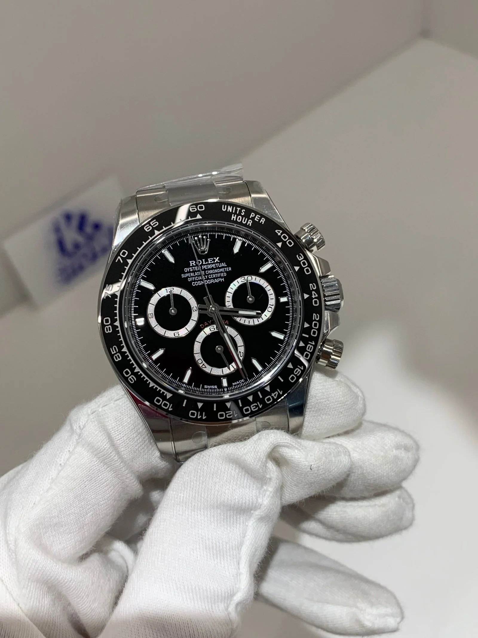 A legendary sporty chronograph masterpiece powered by the true-to-gen VS4130 movement, delivering flawless chronograph functionality and featuring the iconic panda dial (white base with black sub-dials), paired with a 904L oystersteel case and black CERACHROM ceramic bezel that embodies Rolex Daytona’s racing heritage and timeless sporty luxury.