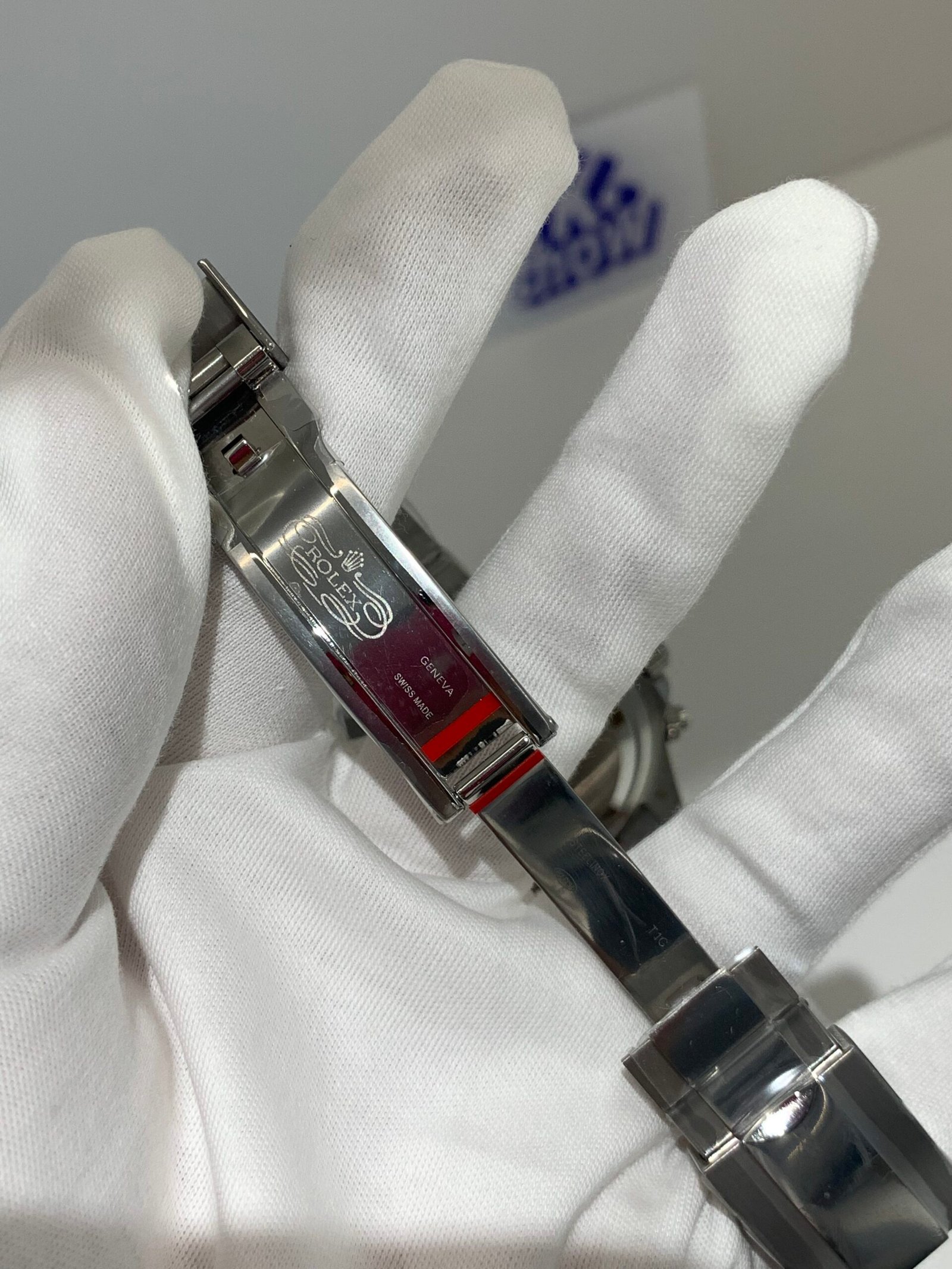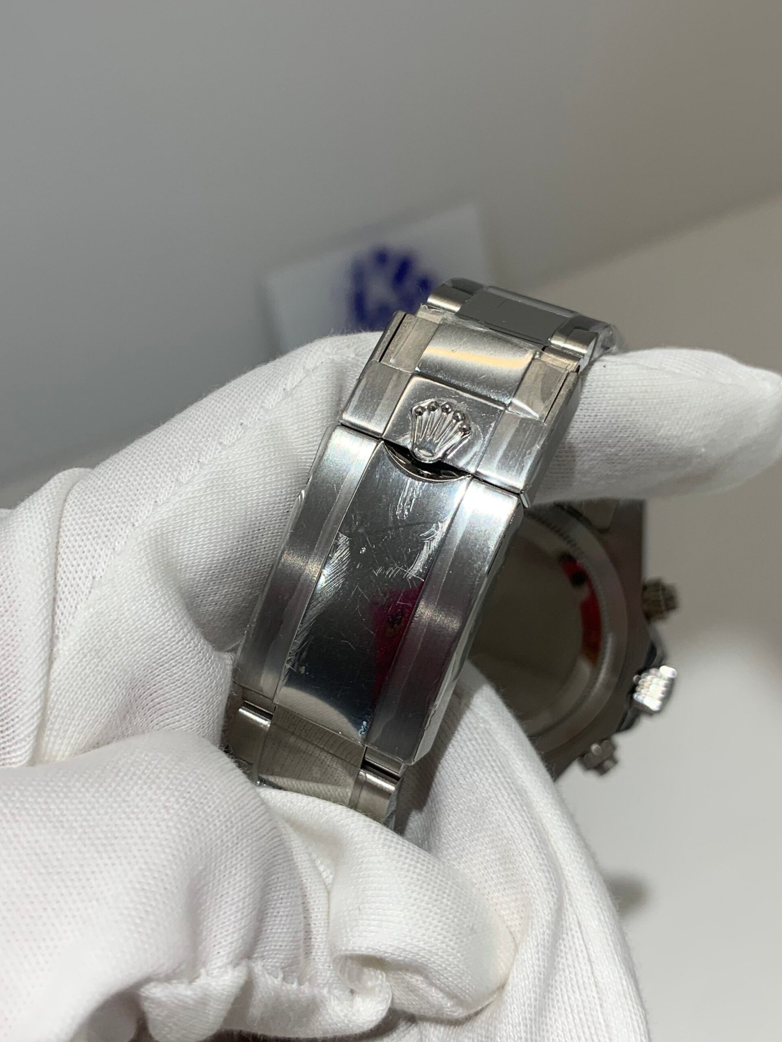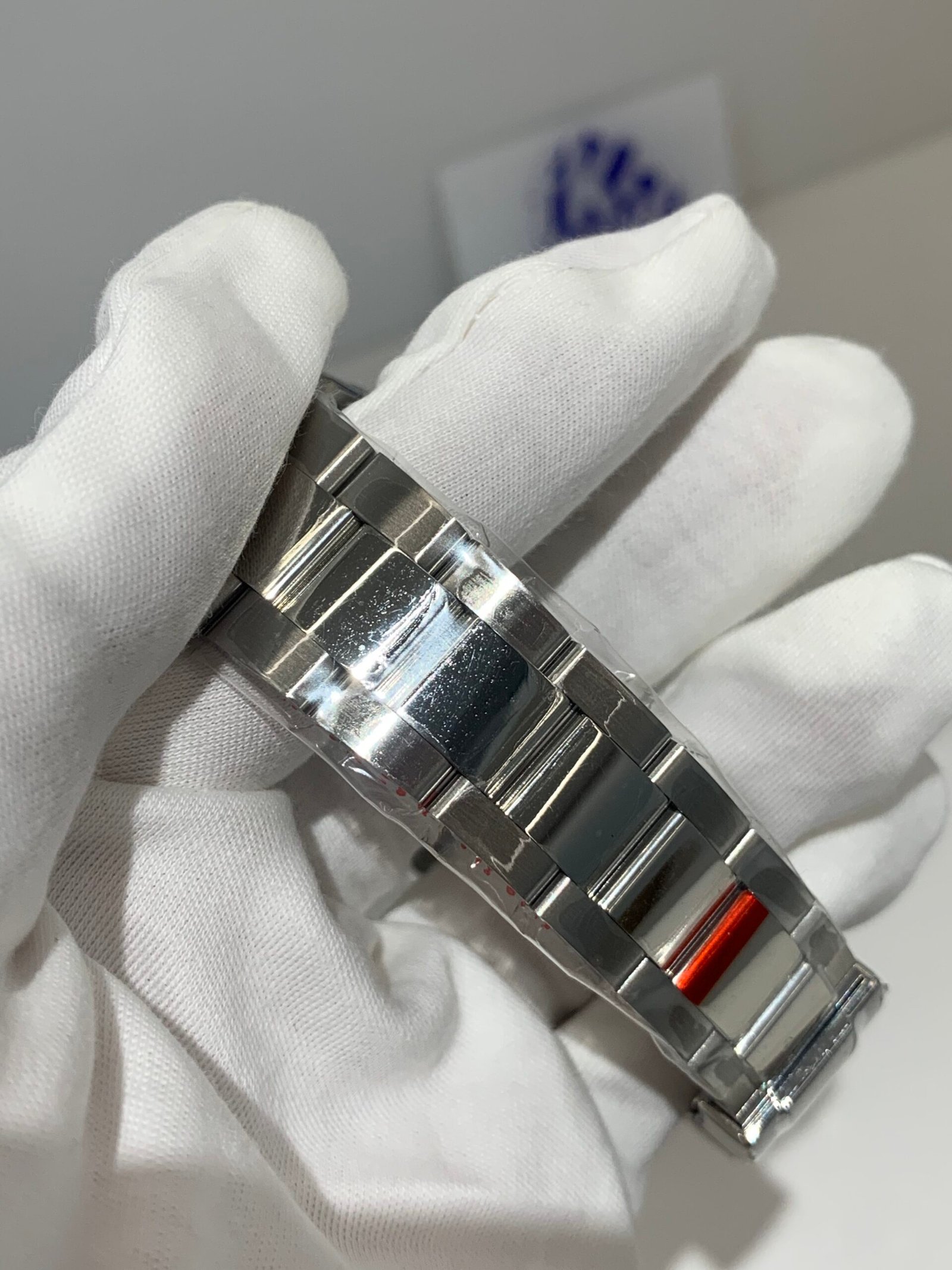 High-brightness polished bezel with sharp, clean engraving. The tachymeter scale is accurately positioned and matches the genuine in font and depth.