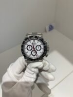 The iconic “Panda” configuration: a crisp white main dial with contrasting black subdials (30min counter at 3H, 12hr counter at 6H, running small seconds at 9H). Applied baton indices and hands are filled with high-intensity Chromalight lume, ensuring perfect legibility day and night.