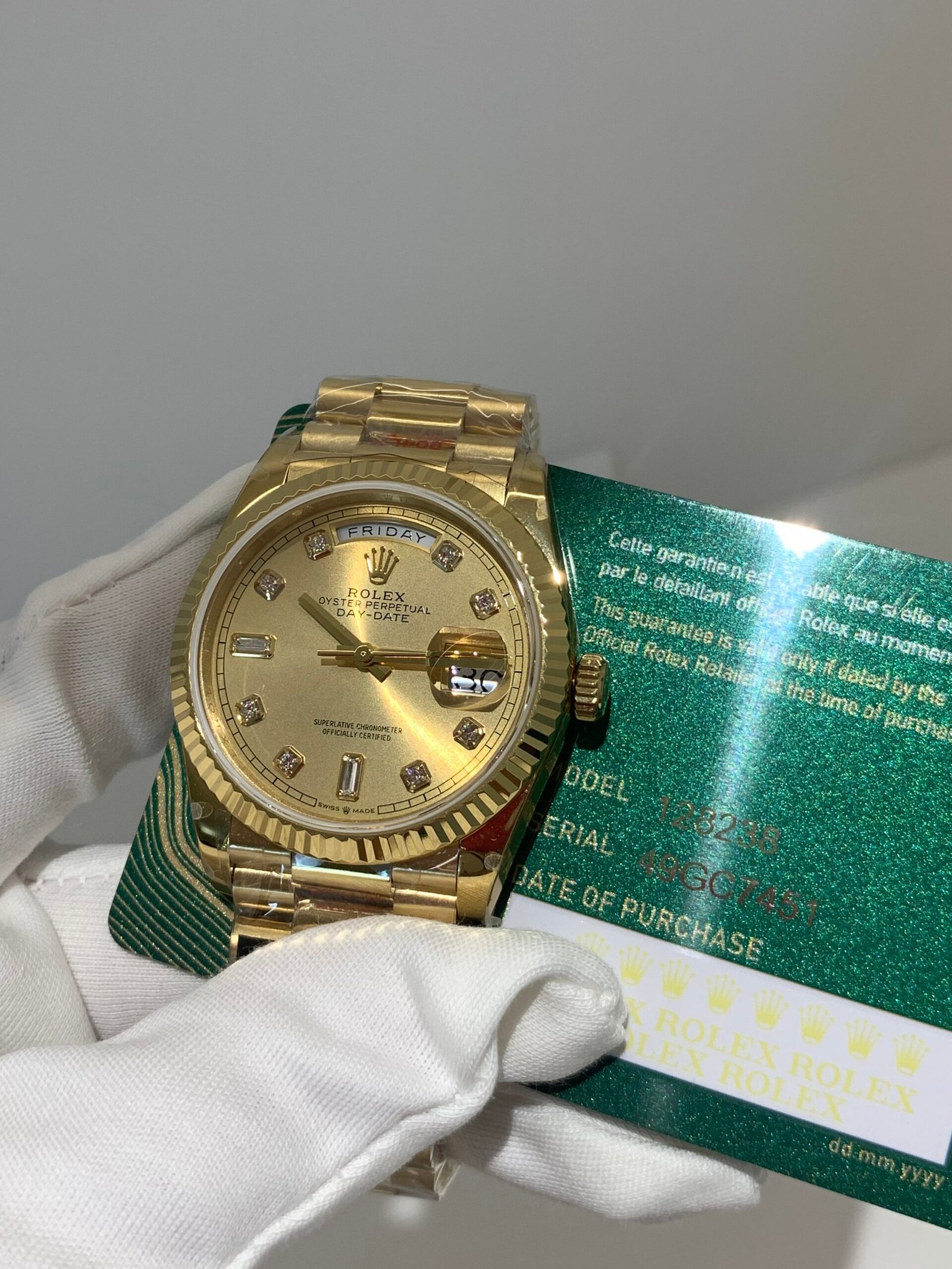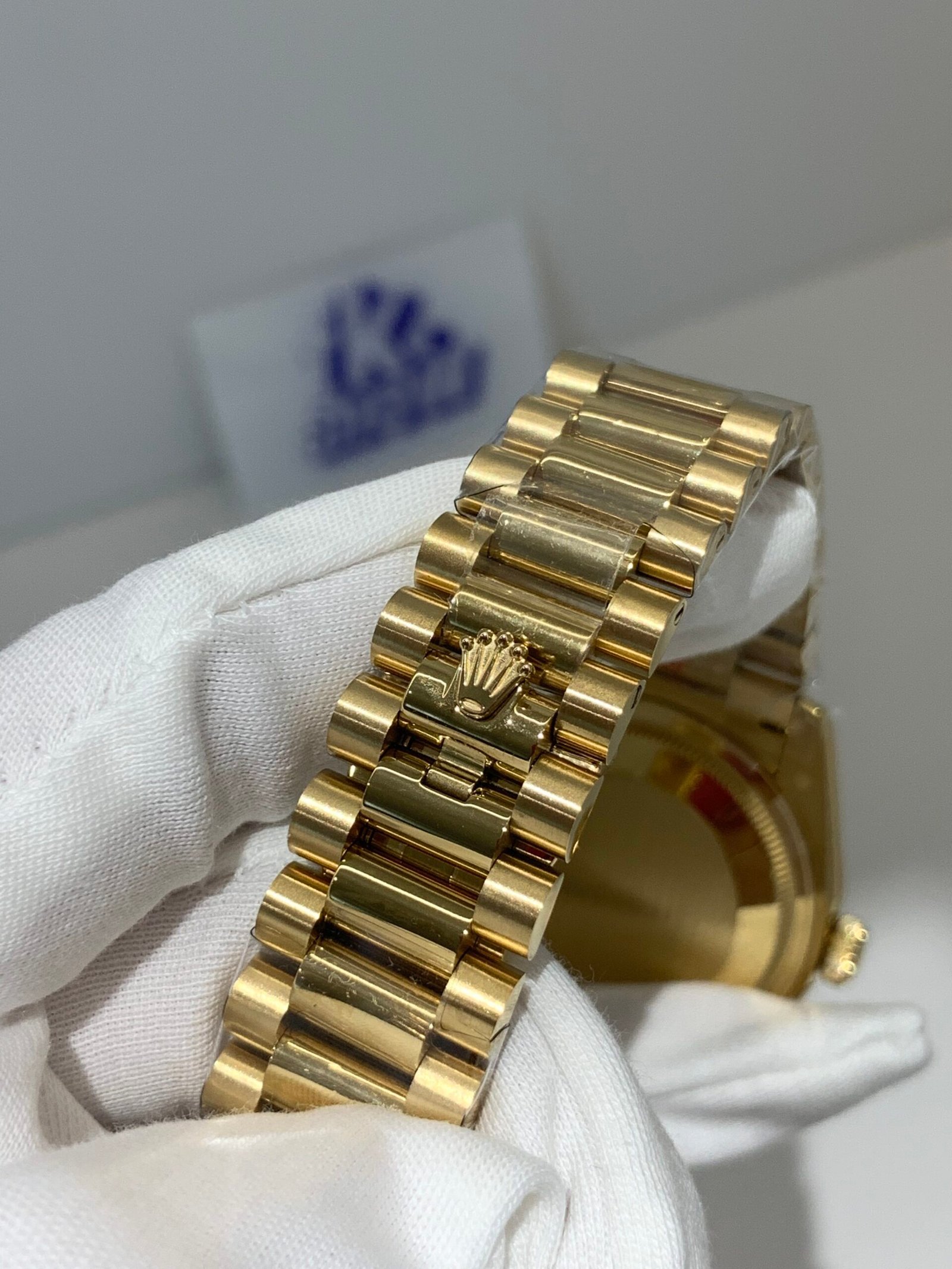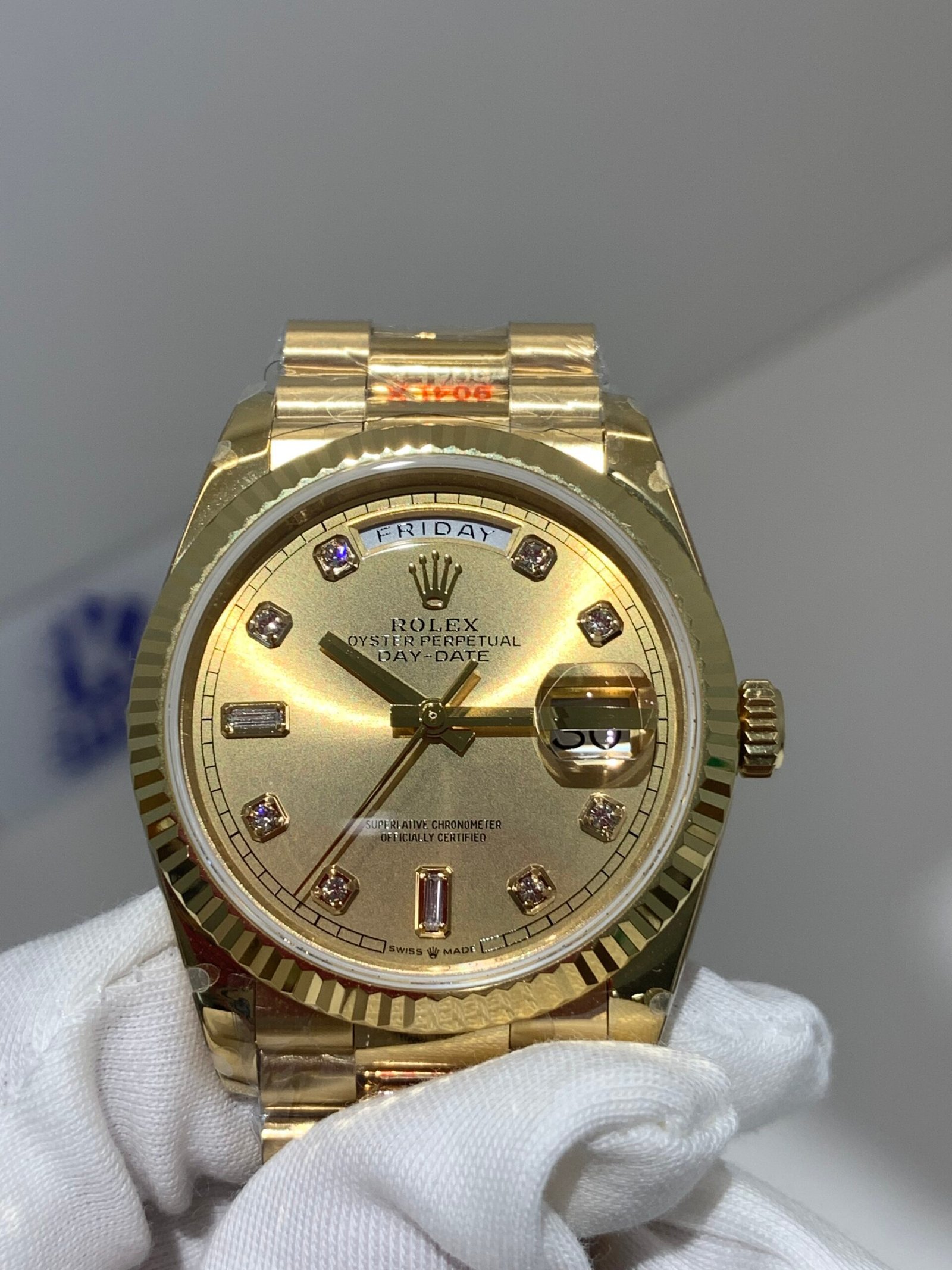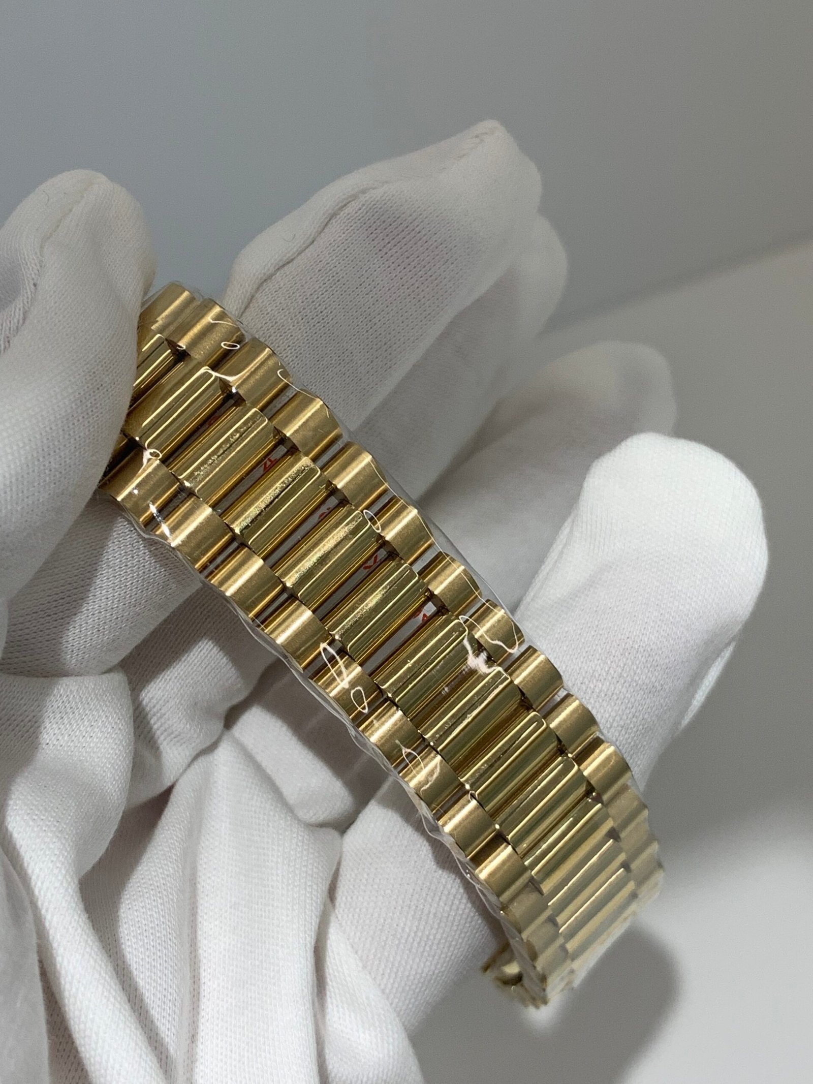 Polished 18K Yellow Gold Fluted Bezel A classic fluted bezel crafted from 18K yellow gold, perfectly polished to a mirror shine—an iconic Rolex signature exclusive to Day-Date models. It frames the dial without distraction and maintains the correct curvature relative to the mid-case, embodying the genuine’s distinguished design.