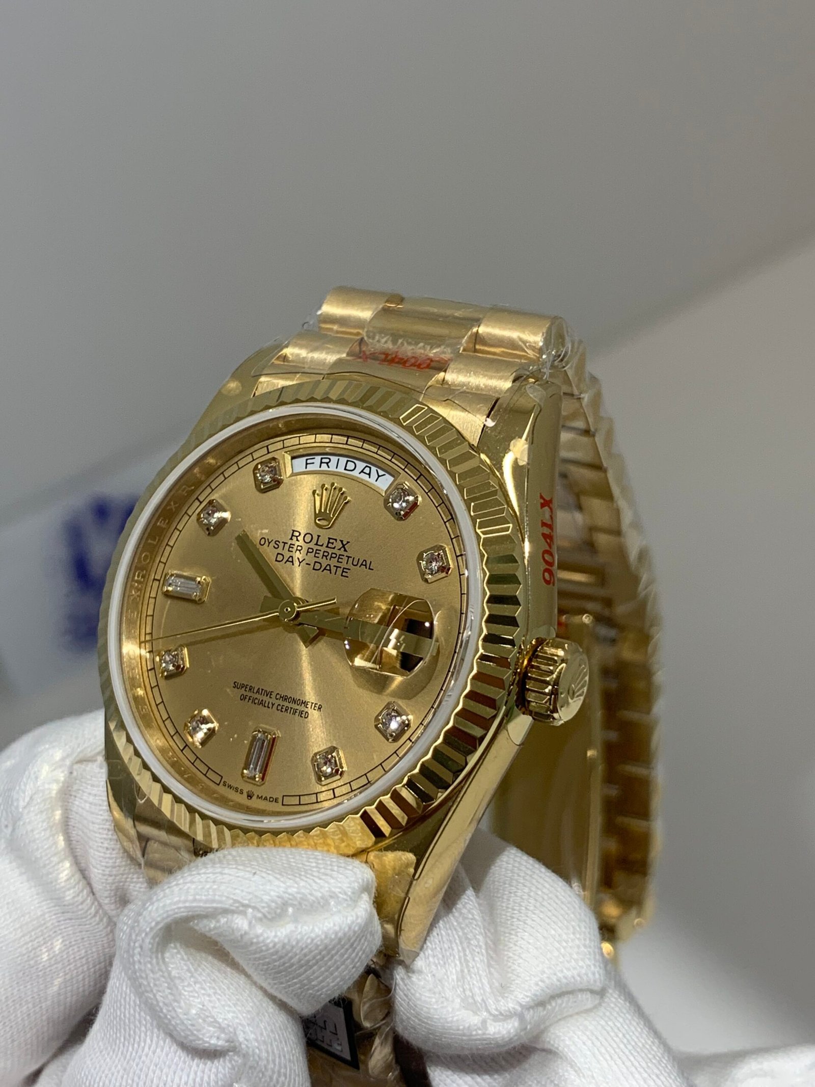 Solid 18K Yellow Gold Finish VSF continues its dominance in case machining. Crafted entirely from 18K yellow gold—true to the genuine Day-Date’s all-precious-metal tradition—the case and President bracelet feature industry-leading polishing and brushing, with a buttery smooth President bracelet taper that feels identical to the genuine article on the wrist, embodying the model’s noble and comfortable wearing experience.