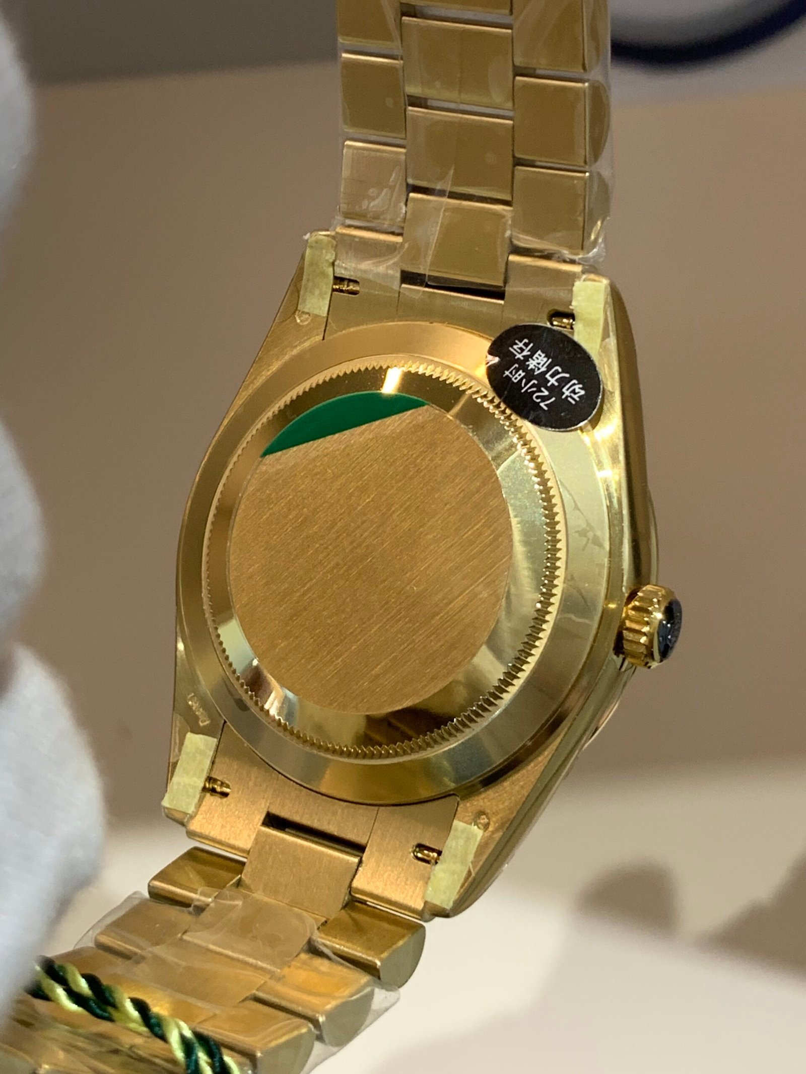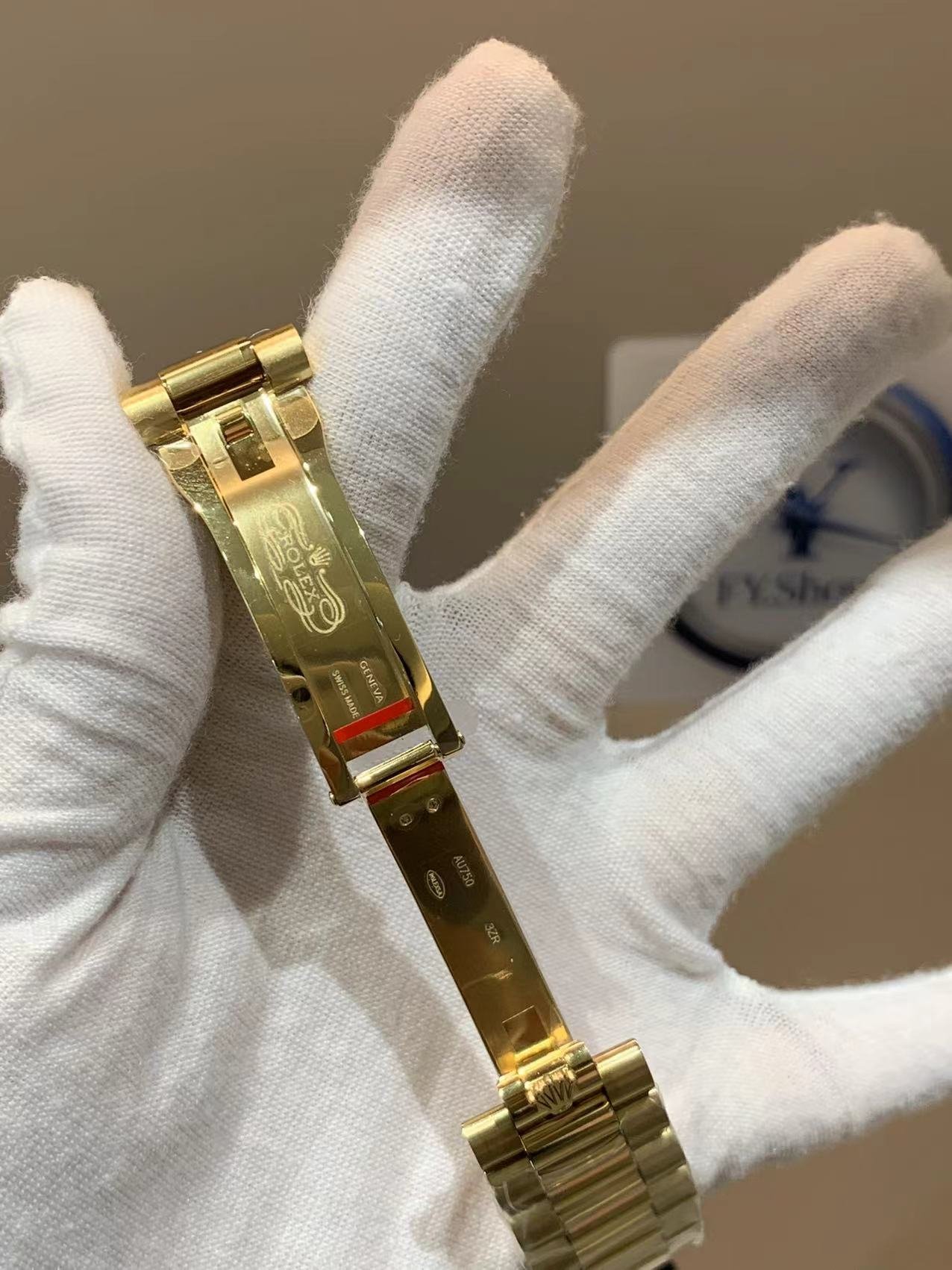 The classic fluted bezel is masterfully crafted in 18K yellow gold, with sharp, even grooves that catch light beautifully and create the signature Day-Date profile. Each flute is precisely cut to match the genuine Rolex specifications, adding depth and dimensionality to the watch’s appearance.