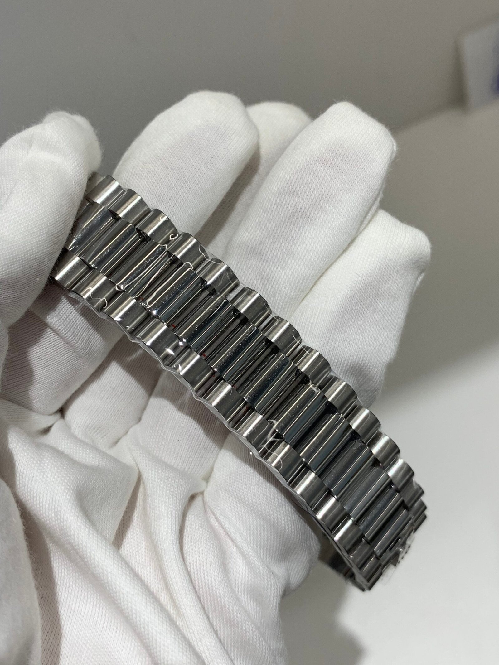 18K White Gold Finish VSF continues its dominance in case machining. Crafted entirely from 18K white gold—true to the genuine Day-Date’s all-precious-metal tradition—the case and President bracelet feature industry-leading polishing and brushing, with a buttery smooth President bracelet taper that feels identical to the genuine article on the wrist, embodying the model’s noble luxury and comfortable wearing experience.