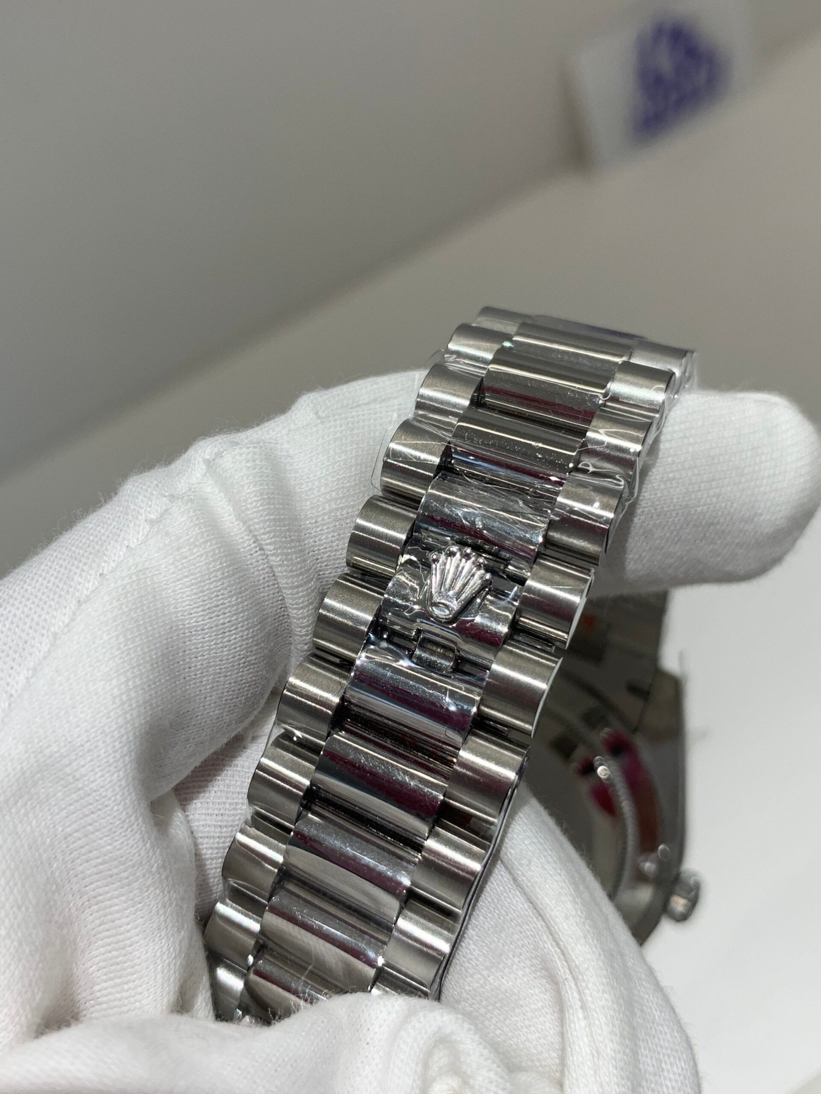 Polished 18K White Gold Fluted Bezel A classic fluted bezel crafted from 18K white gold, perfectly polished to a mirror shine—an iconic Rolex signature exclusive to Day-Date models. It frames the ice-blue dial without distraction and maintains the correct curvature relative to the mid-case, embodying the genuine’s distinguished and elegant design.