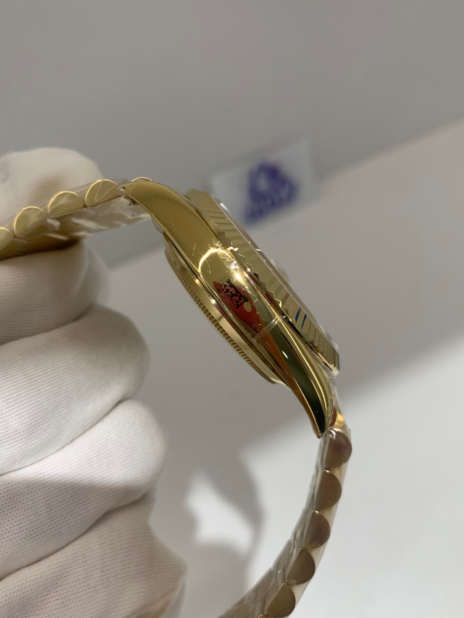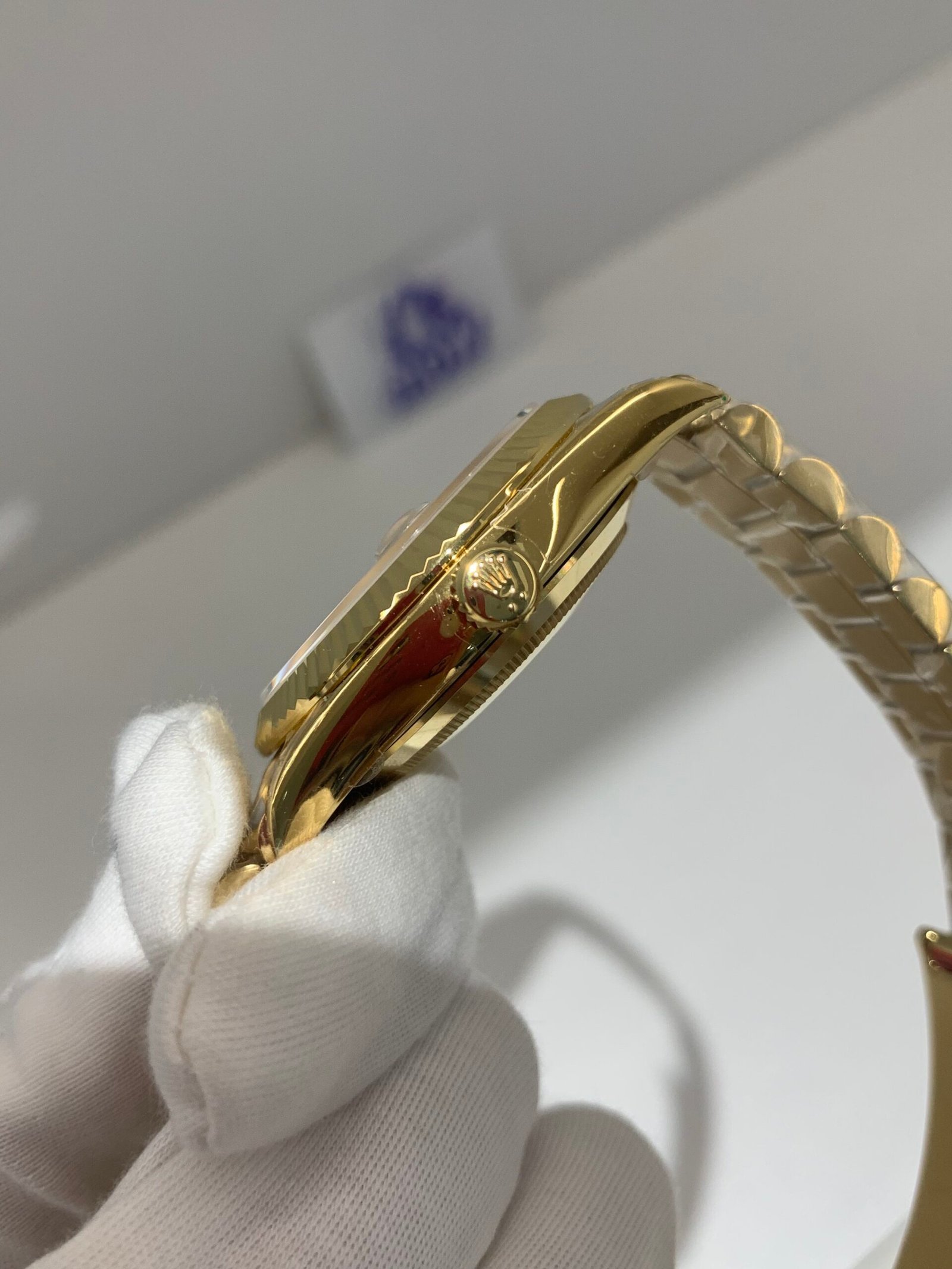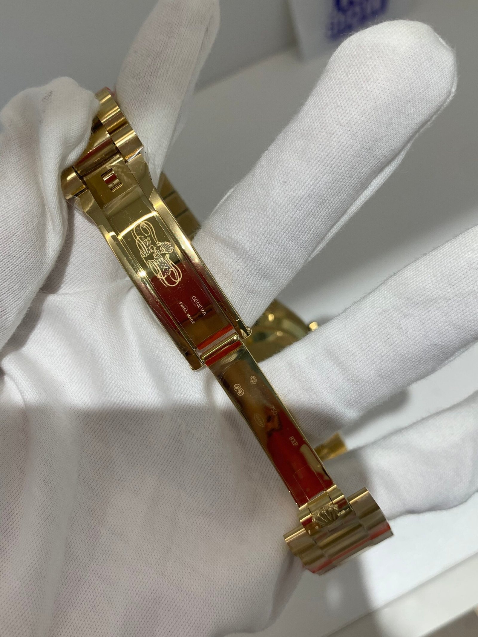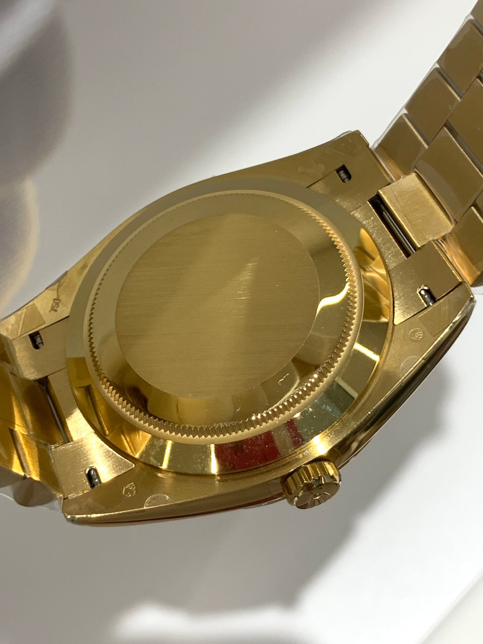 Fluted 18K Gold Bezel. Classic Rolex signature — mirror-polished vertical fluting, correct curvature, perfect fit to the mid-case.