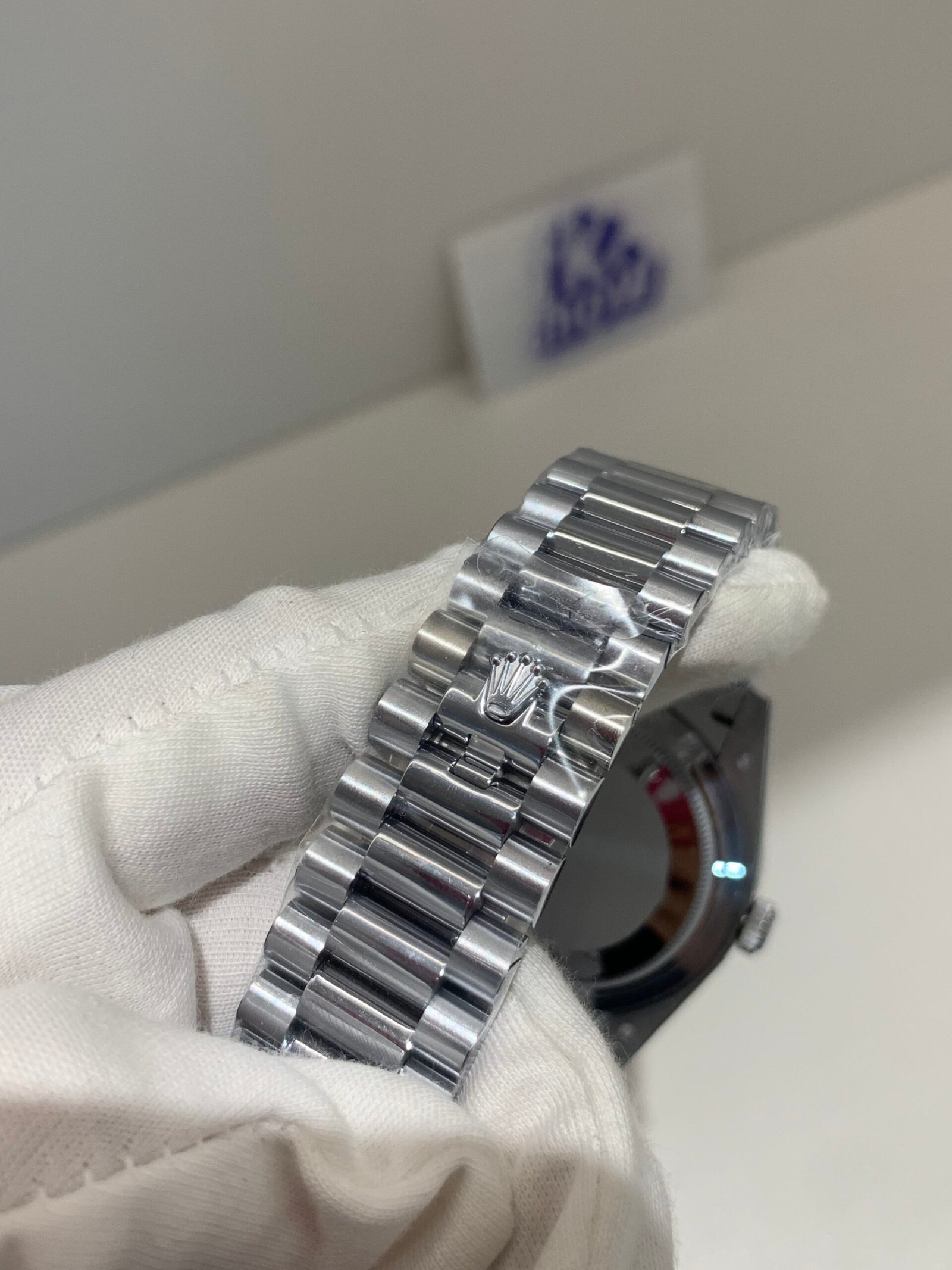 Polished Fluted 18K White Gold (No White Scale Ring on Bezel)A classic fluted bezel, a signature design element of the Day-Date series, crafted from 18K white gold plating and polished to a mirror shine—with no white scale ring on the bezel, adhering to the genuine M228239-0007’s minimalist design. Each flute is precisely cut to match the genuine’s proportions, maintaining the correct curvature relative to the 40mm mid-case, framing the slate grey dial without distraction. The white gold bezel (no white scale ring) enhances the watch’s minimalist luxury texture, perfectly matching the case and bracelet, and complementing the Roman numerals for a more understated and iconic look, just like the genuine model.