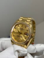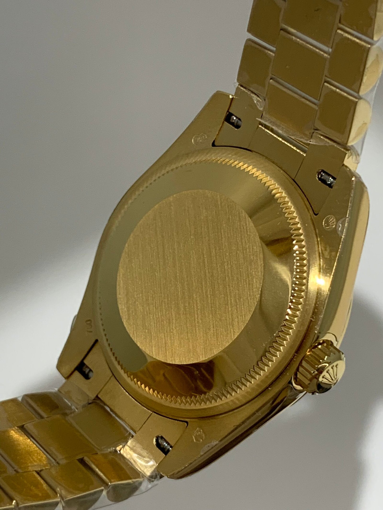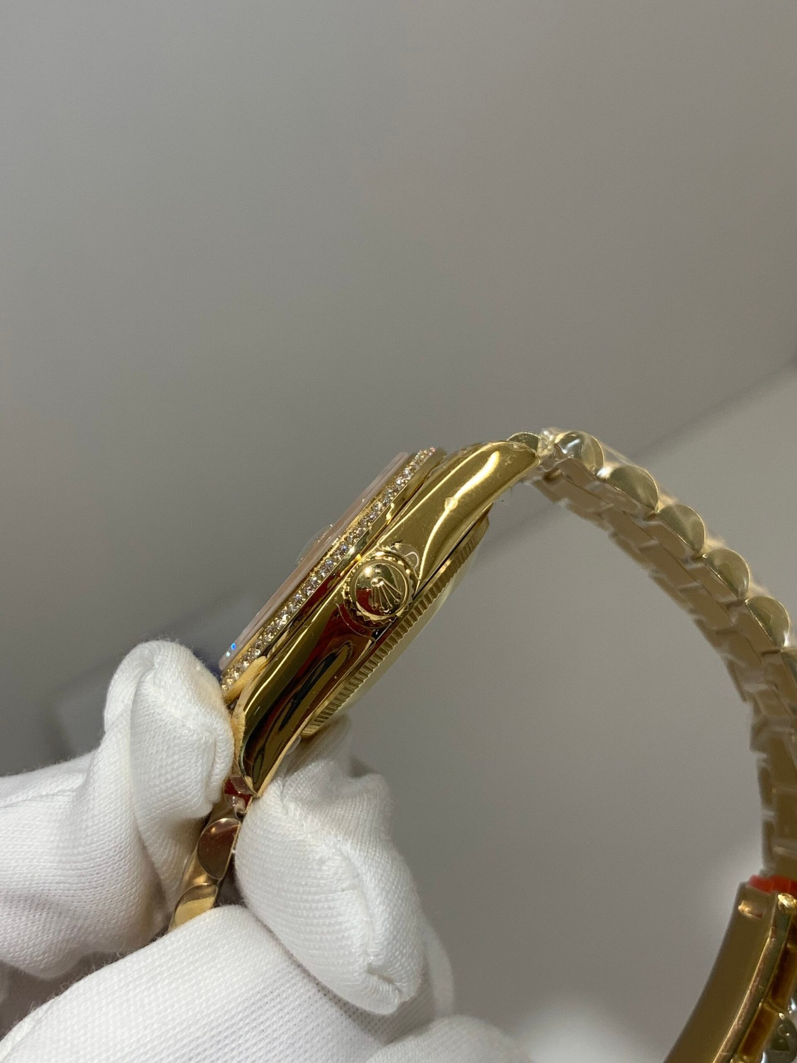 Polished 18K Everose Gold Fluted Bezel A classic fluted bezel crafted from 18K Everose gold, perfectly polished to a mirror shine—an iconic Rolex signature exclusive to Day-Date models. It frames the mother-of-pearl dial without distraction and maintains the correct curvature relative to the mid-case, embodying the genuine’s distinguished and modern design.