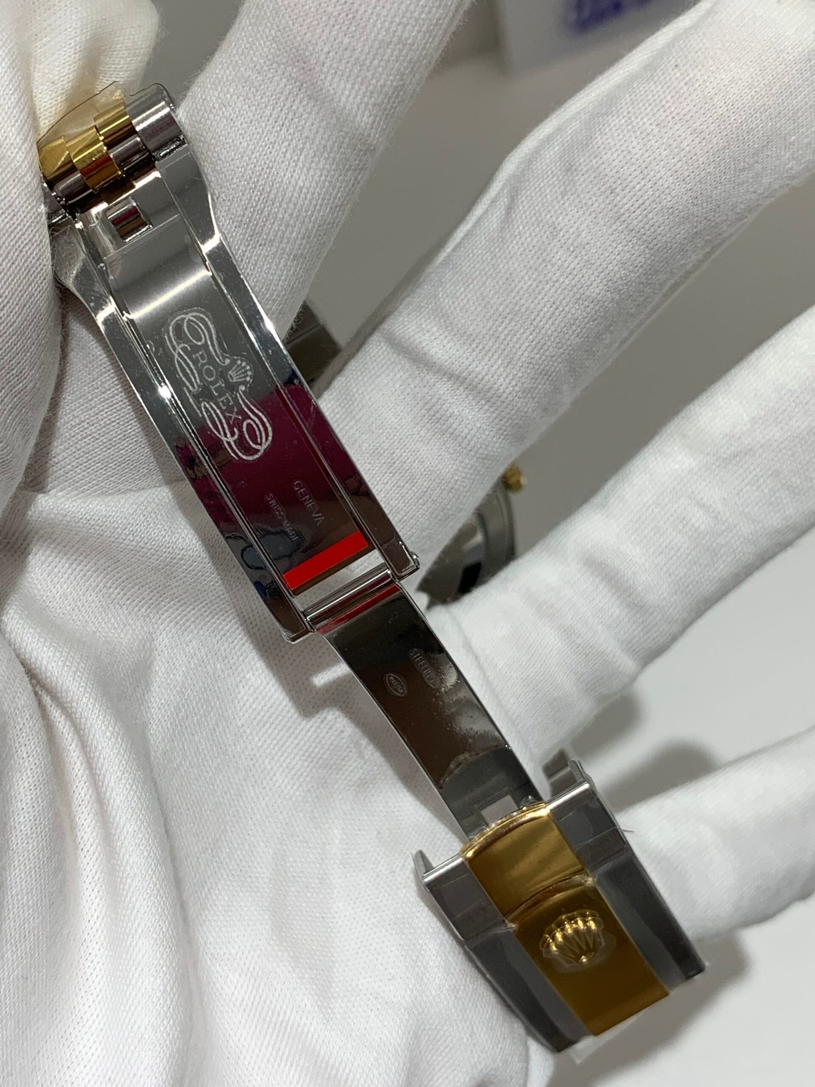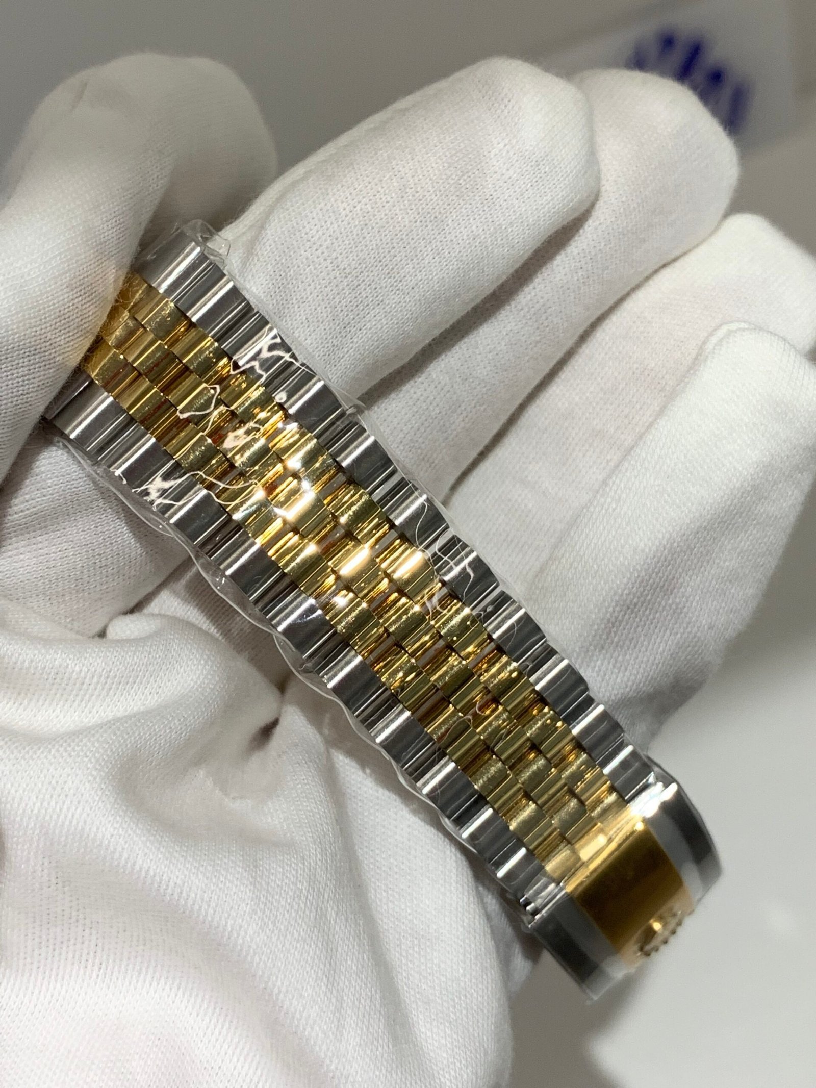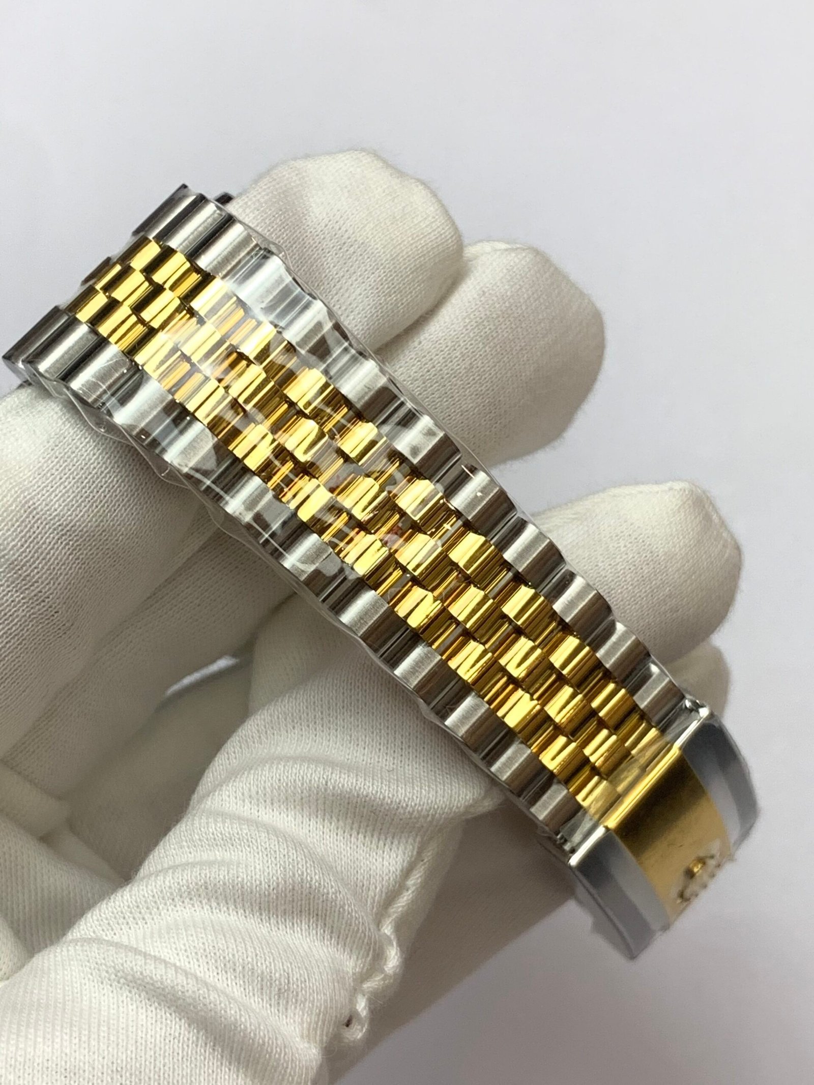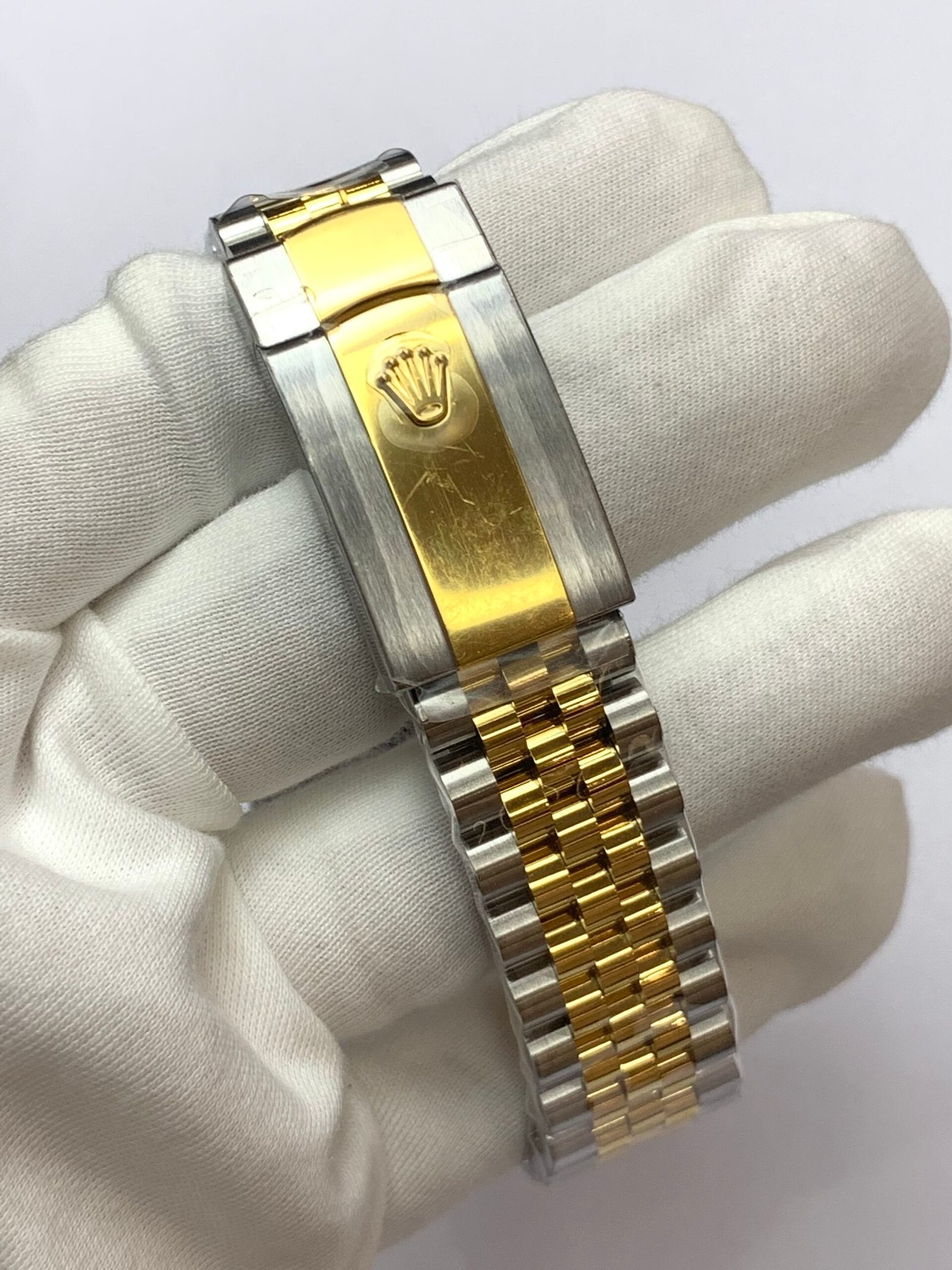 18K Yellow Gold & 904L Oystersteel Finish VSF continues its dominance in case machining. The combination of 18K yellow gold (warm, radiant tone, true to genuine) and 904L stainless steel—known as Yellow Rolesor, a iconic Rolex blend of luxury and strength—features industry-leading brushing on the steel lugs and polished yellow gold accents. The 904L Oystersteel, a high-performance alloy widely used in high technology, aerospace and chemical industries for its maximum corrosion resistance, is extremely durable and maintains its beauty even in harsh environments. The buttery smooth Jubilee bracelet taper feels identical to the genuine article on the wrist, with a perfectly finished clasp that ensures seamless engagement and correct branding, blending warm luxury and rugged durability seamlessly.
