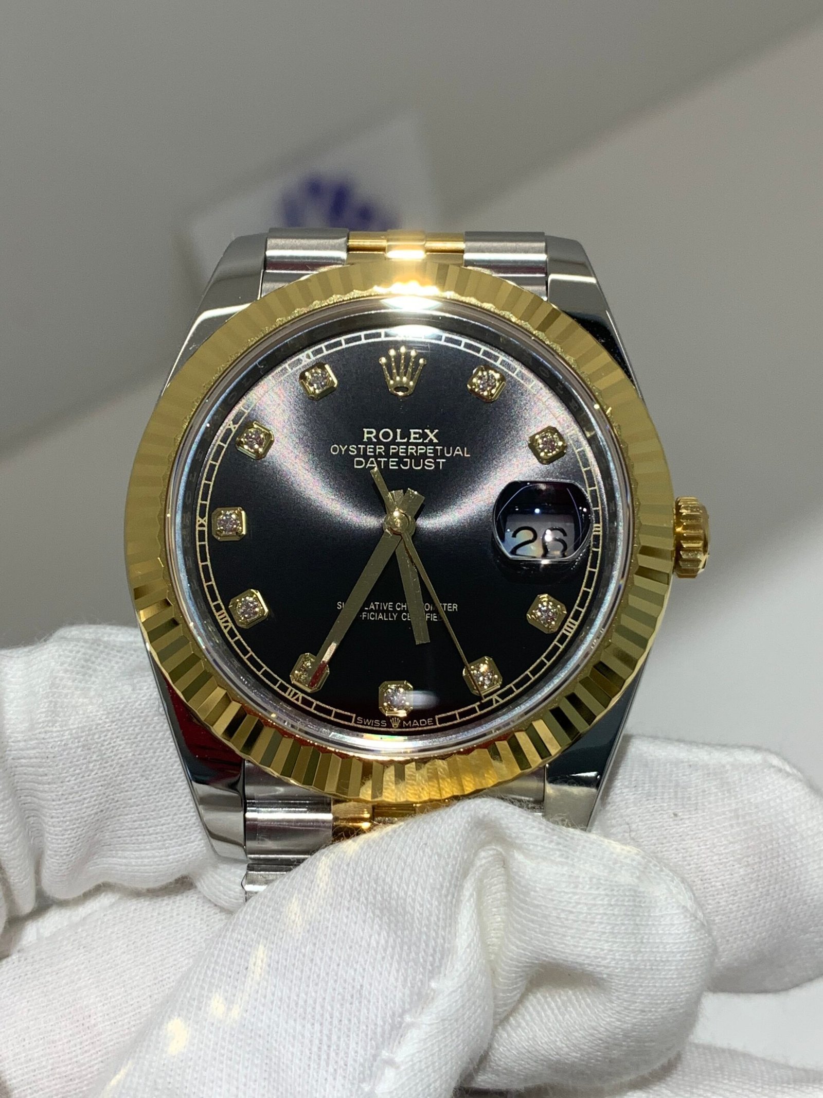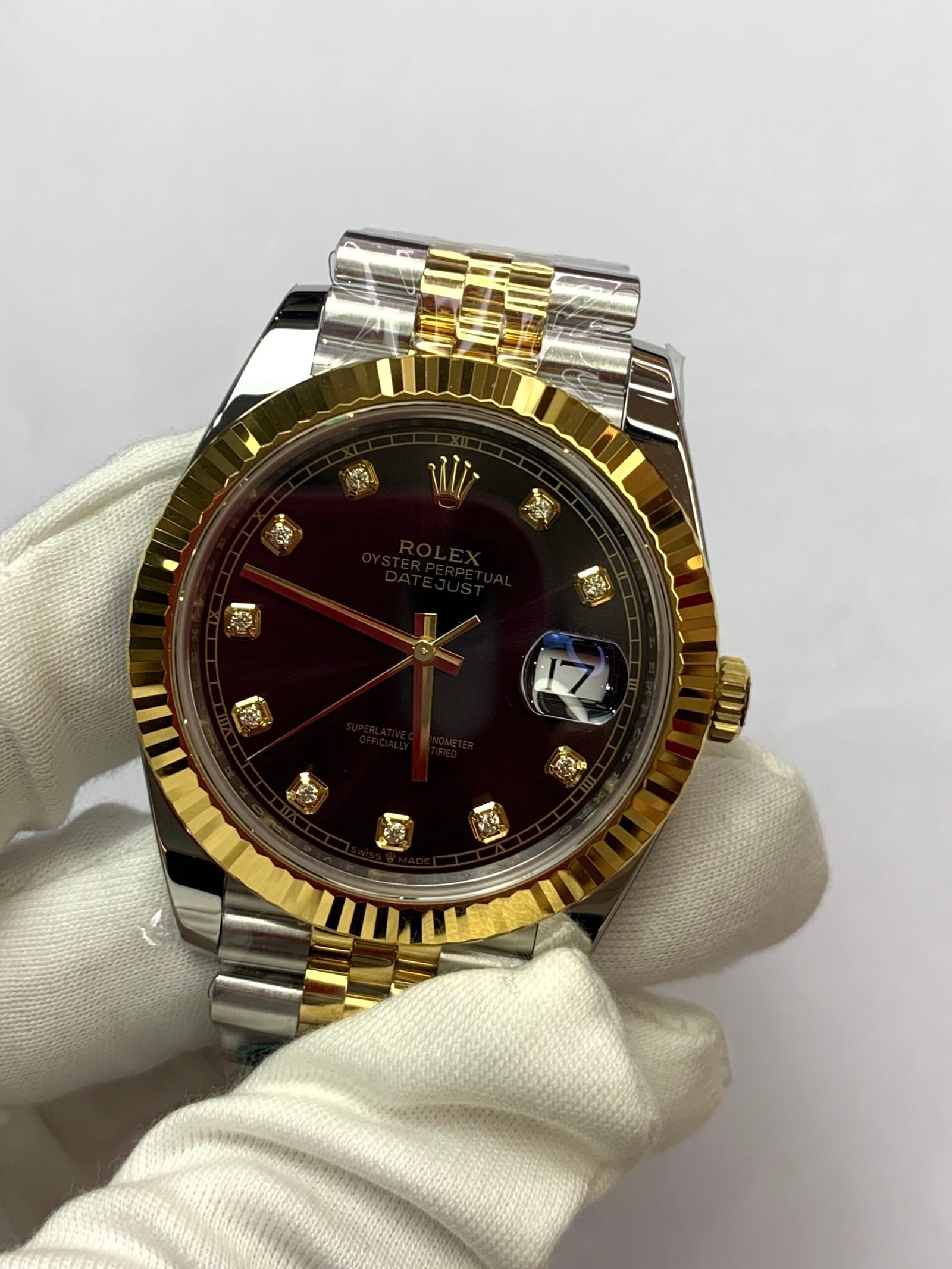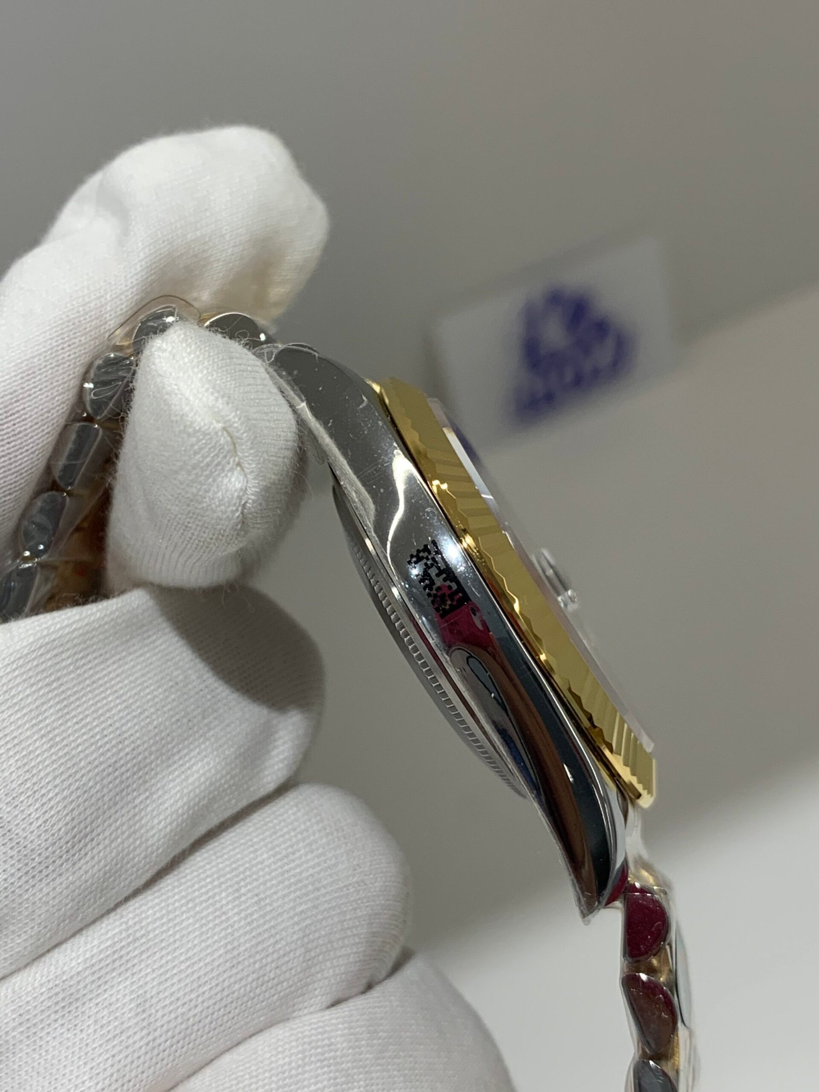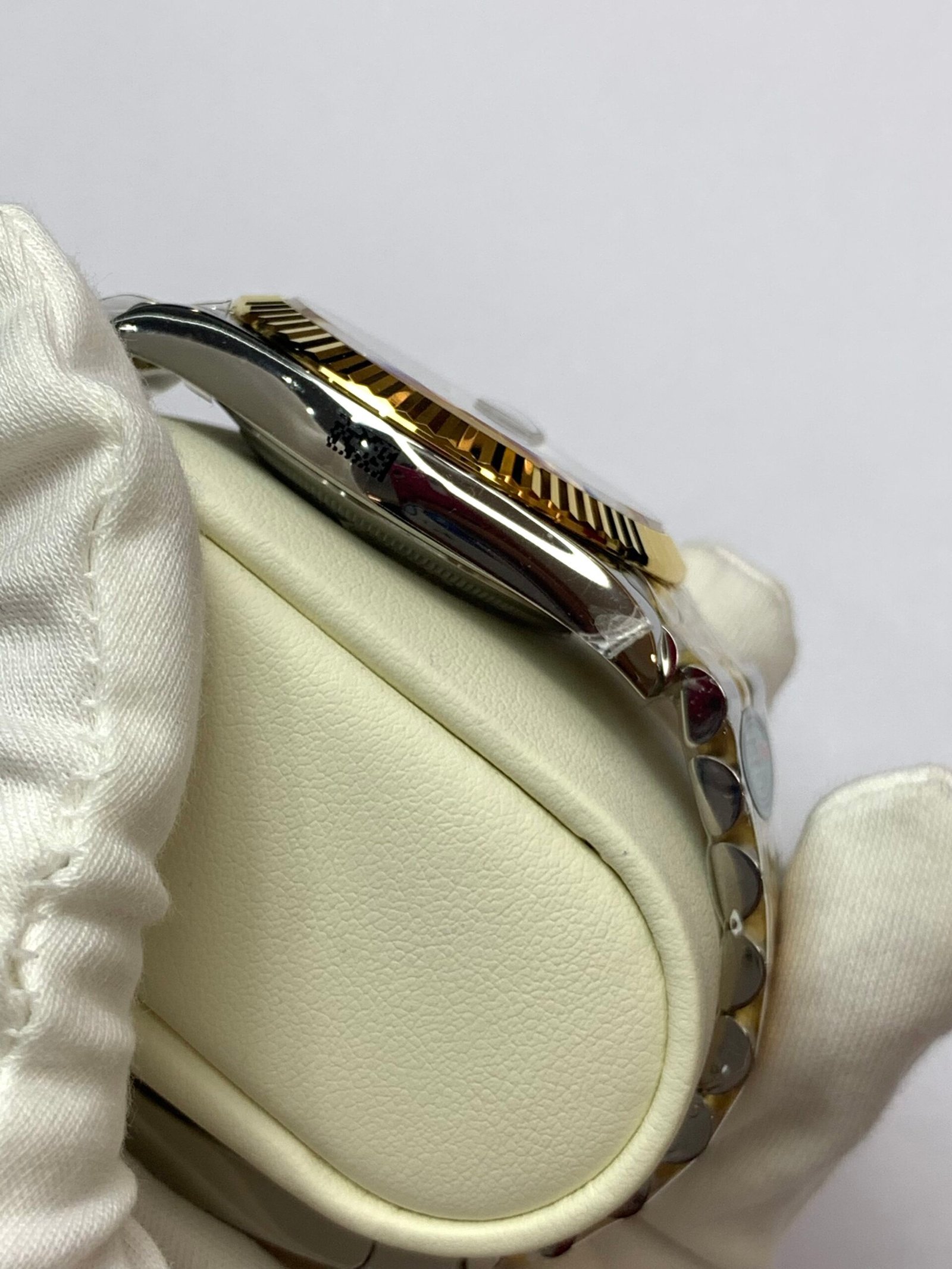 18K Yellow Gold & 904L Oystersteel Finish VSF continues its dominance in case machining. The combination of 18K yellow gold (warm, radiant tone, true to genuine) and 904L stainless steel—known as Yellow Rolesor, a iconic Rolex blend of luxury and strength—features industry-leading brushing on the steel lugs and polished yellow gold accents. The 904L Oystersteel, a high-performance alloy widely used in high technology, aerospace and chemical industries for its maximum corrosion resistance, is extremely durable and maintains its beauty even in harsh environments. The buttery smooth Jubilee bracelet taper feels identical to the genuine article on the wrist, with a perfectly finished clasp that ensures seamless engagement and correct branding, blending warm luxury and rugged durability seamlessly.