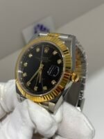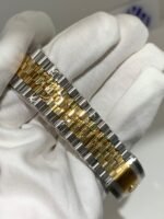 Polished 18K Yellow Gold Fluted Bezel A classic fluted bezel crafted from 18K yellow gold, perfectly polished to a mirror shine—an iconic Rolex signature. Originally designed for functional waterproofing (to screw the bezel onto the case securely), the fluting now serves as a distinguished aesthetic element, framing the silver sunburst dial elegantly without distraction and maintaining the correct curvature relative to the mid-case, matching the genuine’s proportions exactly. The polished yellow gold bezel complements the warm tone of the dial, highlighting the model’s luxurious temperament.