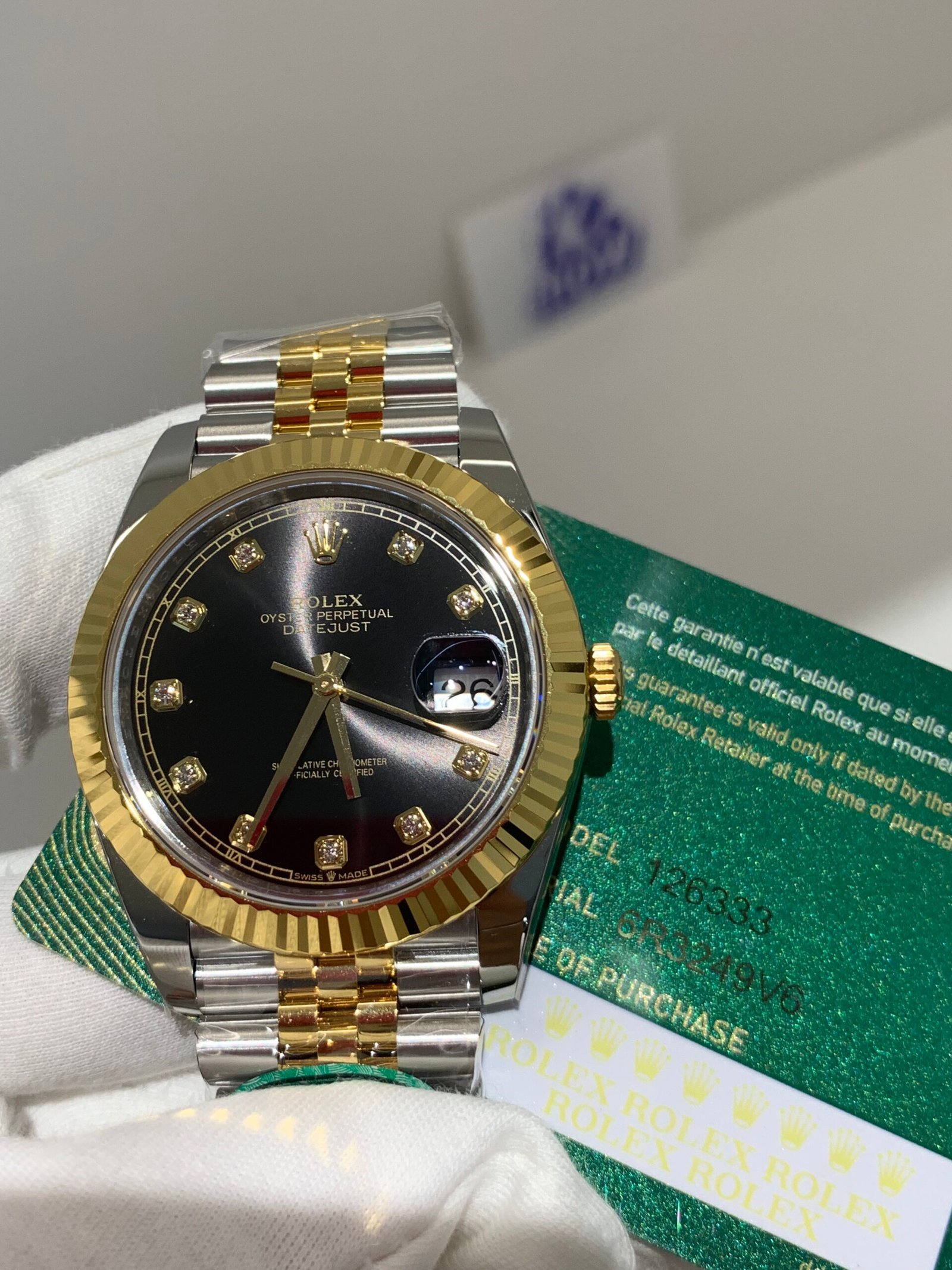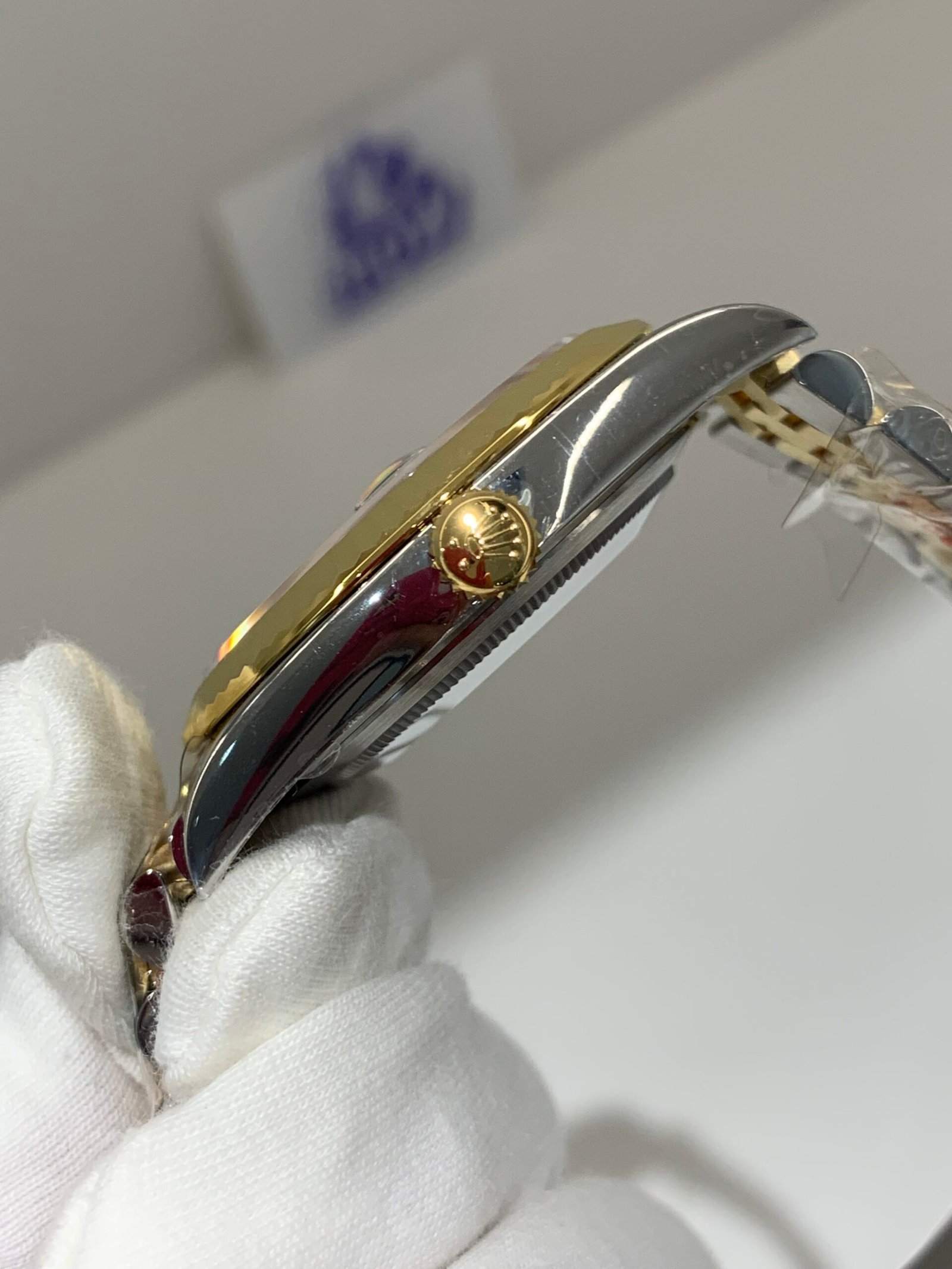 Crystal Clarity VSF is unrivaled in crystal production. The scratch-resistant sapphire is incredibly clear, with no milky ring effect (white edge) and correct internal AR coating, making the silver sunburst dial pop in any lighting. The crystal’s domed shape and date magnifier are true to genuine, with precise edge polishing, ensuring optimal readability in all environments while complementing the yellow gold details—consistent with the genuine’s anti-reflective and scratch-resistant standards, and matching the iconic Cyclops lens design of Rolex Date models.