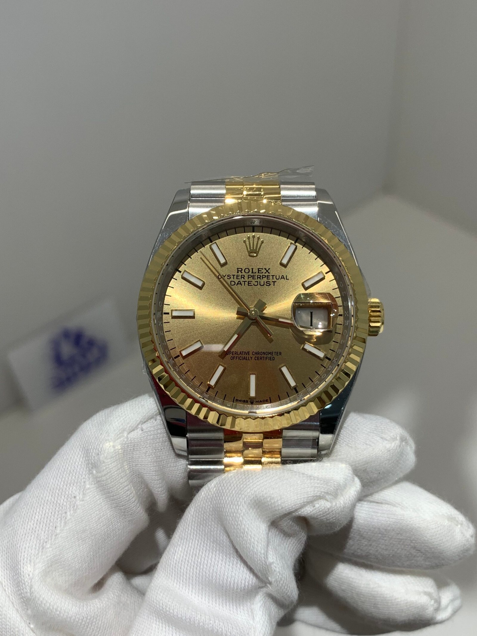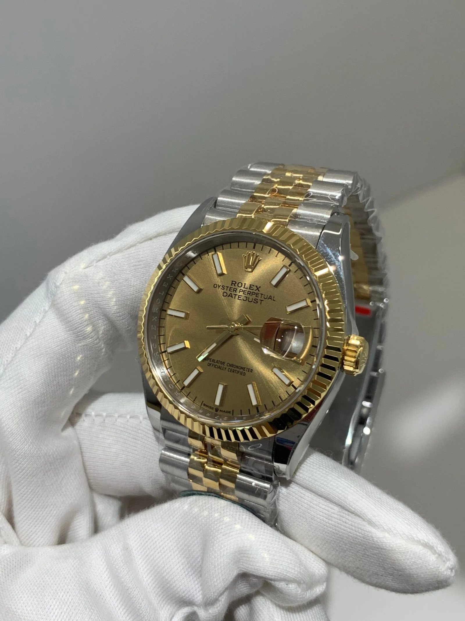 Crystal Clarity VSF is unrivaled in crystal production. The scratch-resistant sapphire is incredibly clear, with no milky ring effect (white edge) and correct internal AR coating, making the chocolate brown sunburst dial pop in any lighting and highlighting its rich color layers. The crystal’s domed shape and date magnifier are true to genuine, with precise edge polishing, ensuring optimal readability in all environments while complementing the yellow gold details—consistent with the genuine’s anti-reflective and scratch-resistant standards, and matching the iconic Cyclops lens design of Rolex Date models.