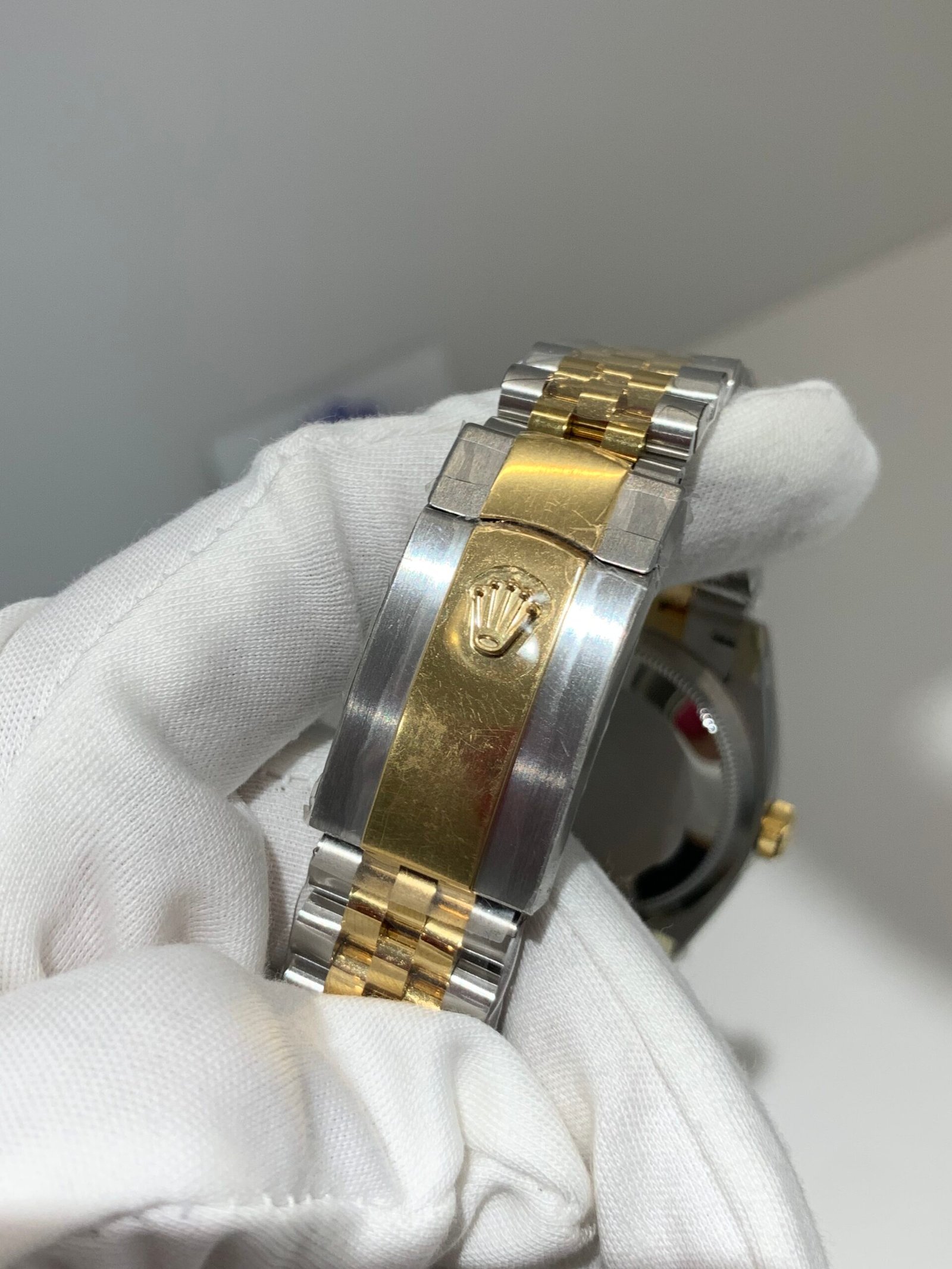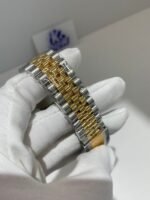 18K Yellow Gold & 904L Oystersteel Finish VSF continues its dominance in case machining. The combination of 18K yellow gold (warm, radiant tone, true to genuine) and 904L stainless steel—known as Yellow Rolesor, a iconic Rolex blend of luxury and strength—features industry-leading brushing on the steel lugs and polished yellow gold accents. The 904L Oystersteel, a high-performance alloy widely used in high technology, aerospace and chemical industries for its maximum corrosion resistance, is extremely durable and maintains its beauty even in harsh environments. The buttery smooth Jubilee bracelet taper feels identical to the genuine article on the wrist, with a perfectly finished clasp that ensures seamless engagement and correct branding, blending warm luxury and rugged durability seamlessly.