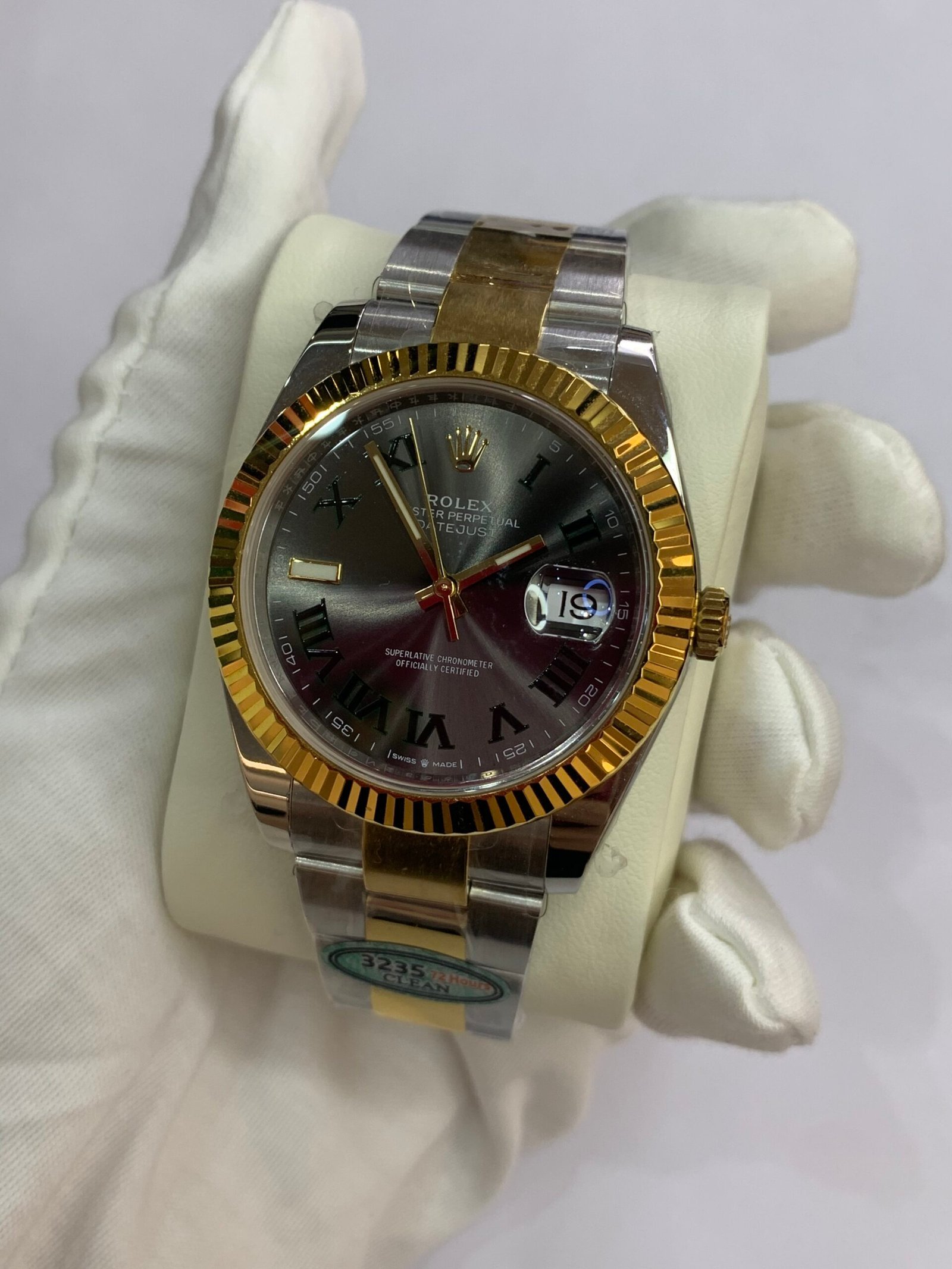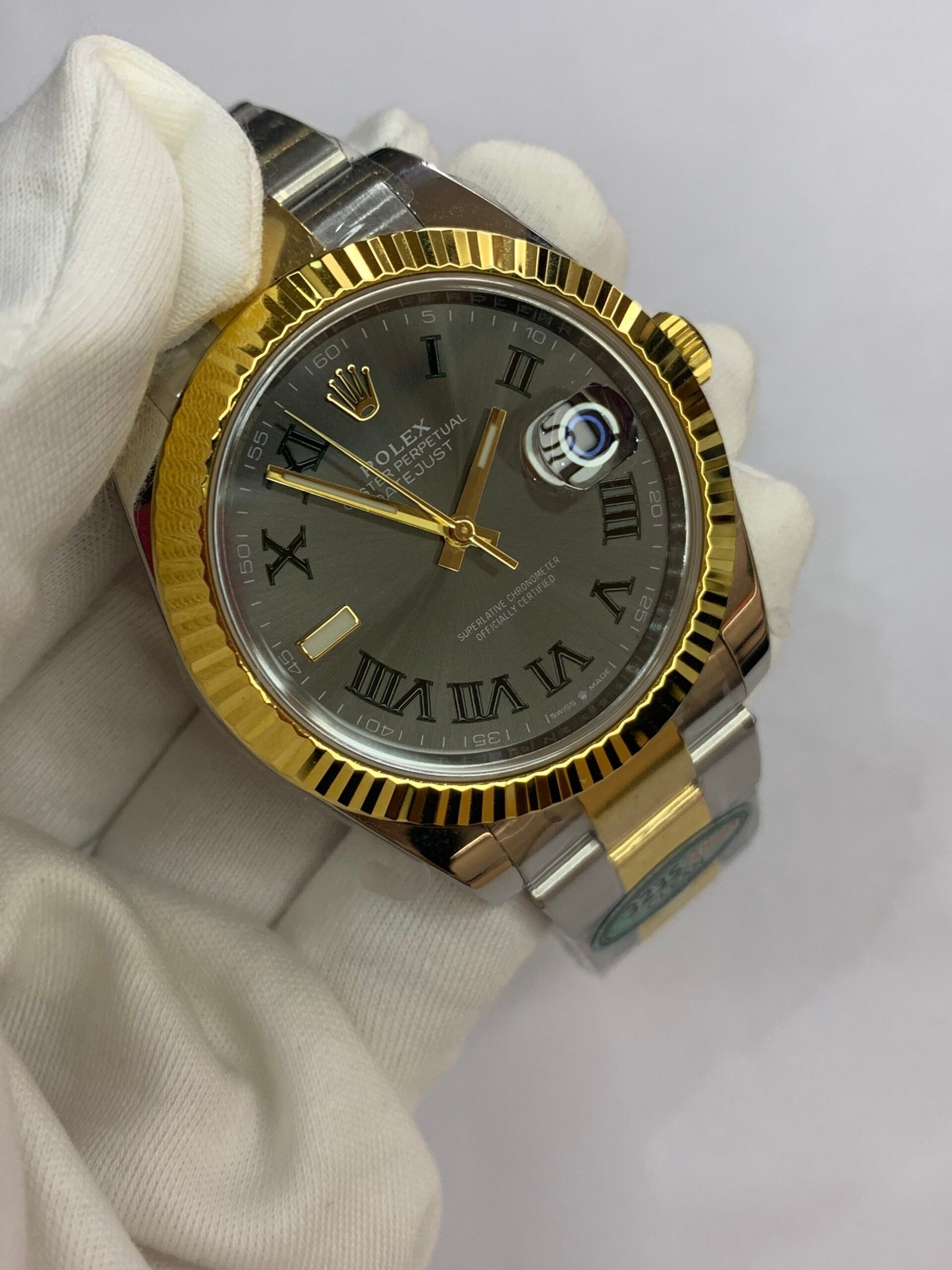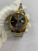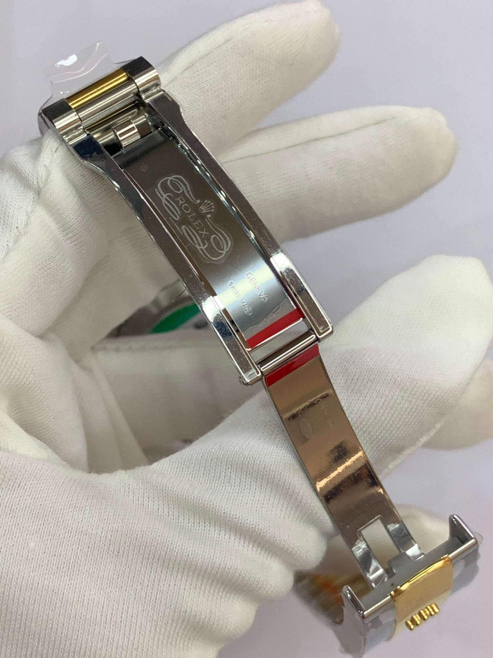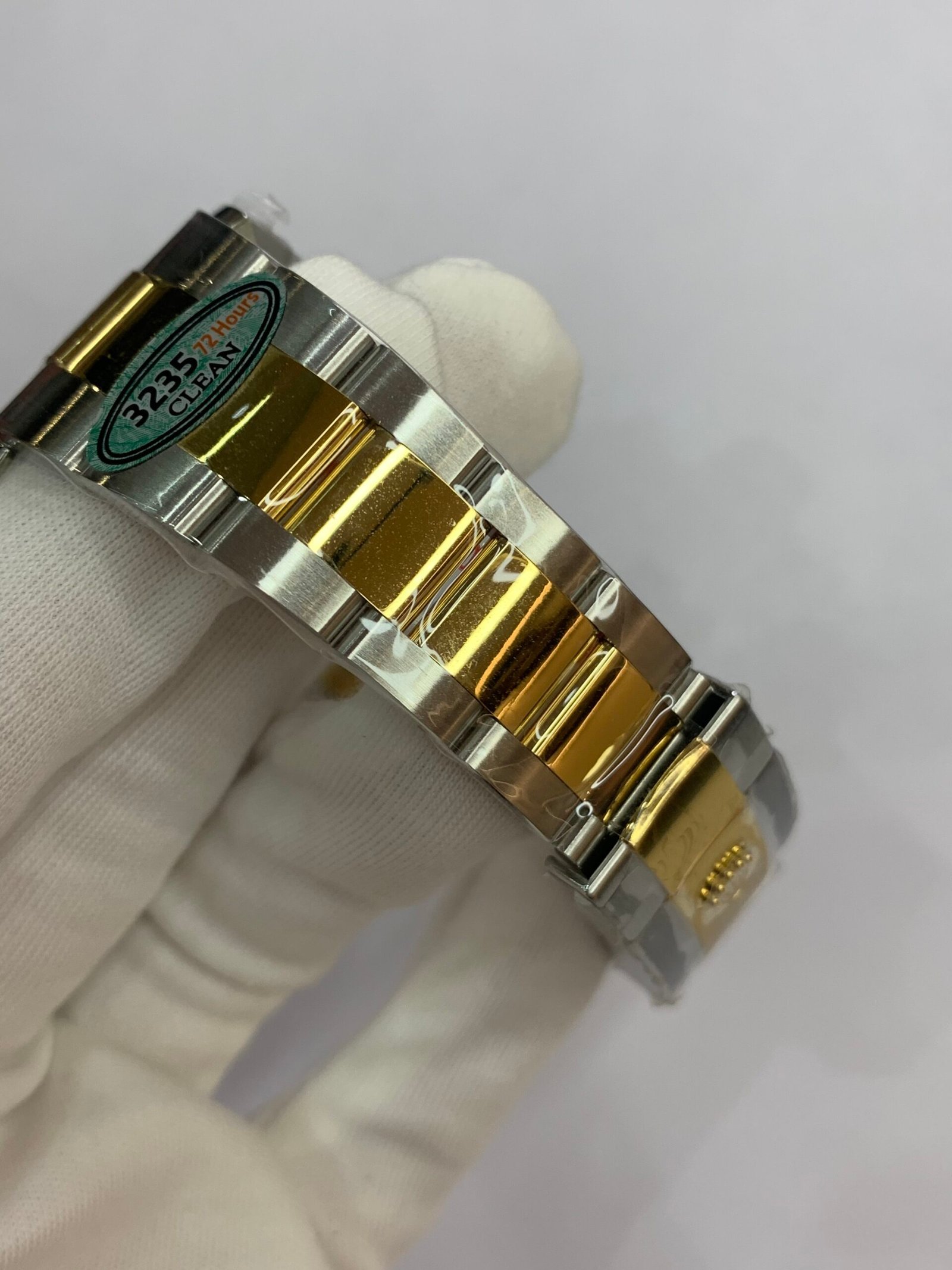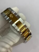 18K Yellow Gold & 904L Oystersteel Finish VSF continues its dominance in case machining. The combination of 18K yellow gold (warm, radiant tone, true to genuine) and 904L stainless steel—known as Yellow Rolesor, a iconic Rolex blend of luxury and strength—features industry-leading brushing on the steel lugs and polished yellow gold accents. The 904L Oystersteel, a high-performance alloy widely used in high technology, aerospace and chemical industries for its maximum corrosion resistance, is extremely durable and maintains its beauty even in harsh environments. The buttery smooth Jubilee bracelet taper feels identical to the genuine article on the wrist, with a perfectly finished clasp that ensures seamless engagement and correct branding, blending warm luxury and rugged durability seamlessly.