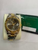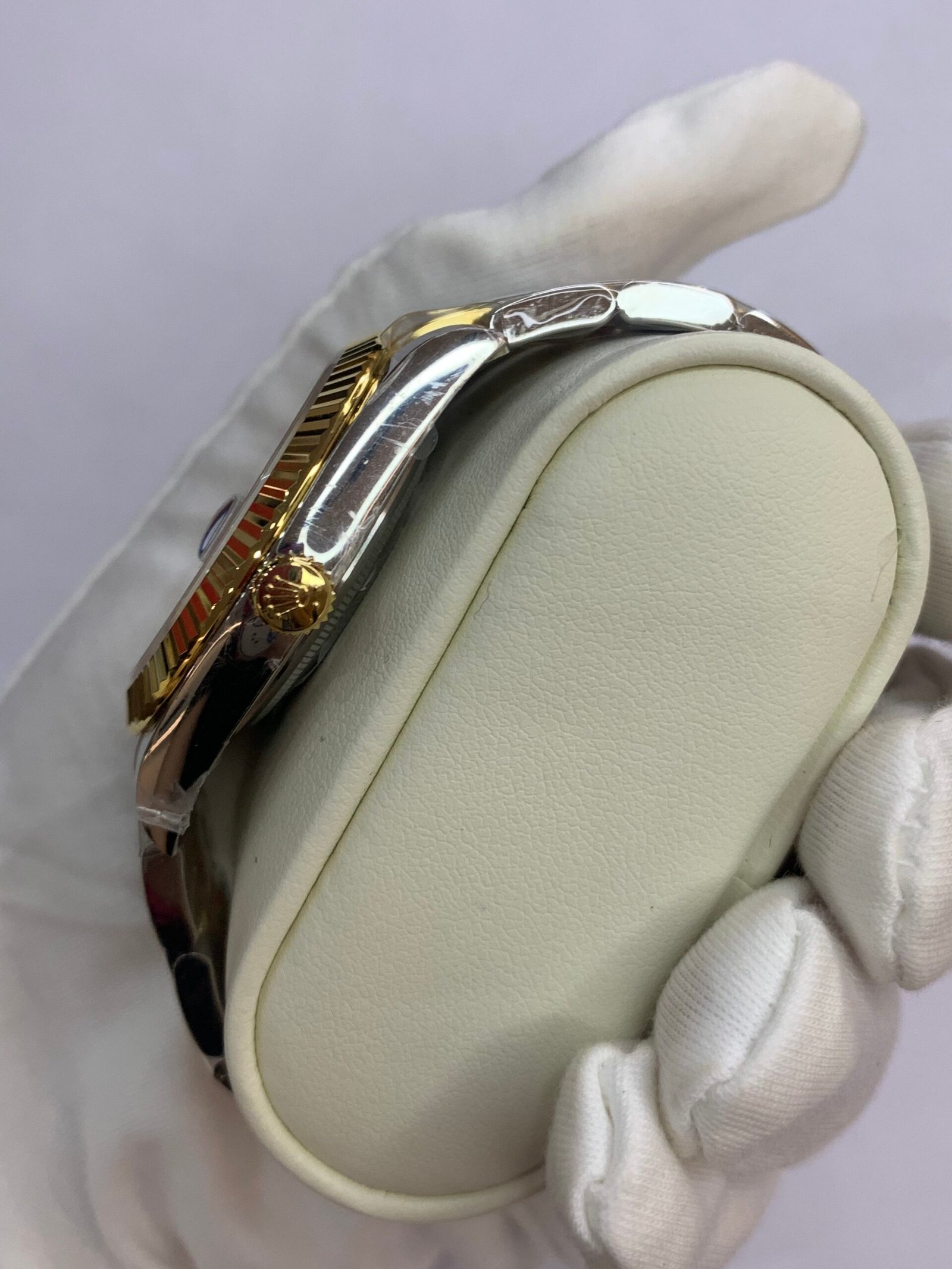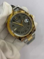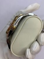 Polished 18K Yellow Gold Fluted Bezel A classic fluted bezel crafted from 18K yellow gold, perfectly polished to a mirror shine—an iconic Rolex signature. Originally designed for functional waterproofing (to screw the bezel onto the case securely), the fluting now serves as a distinguished aesthetic element, framing the champagne sunburst dial elegantly without distraction and maintaining the correct curvature relative to the mid-case, matching the genuine’s proportions exactly. The polished yellow gold bezel complements the warm, radiant tone of the champagne dial, highlighting the model’s luxurious temperament and harmonizing with the Yellow Rolesor material blend.