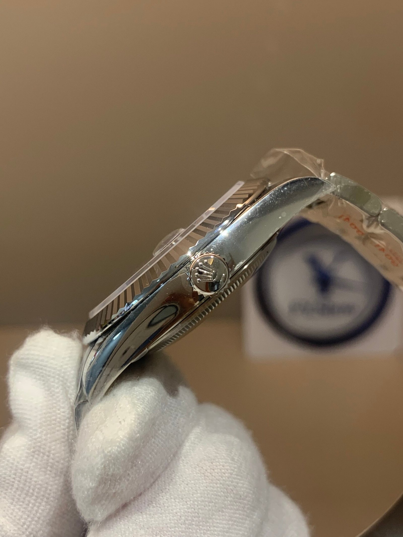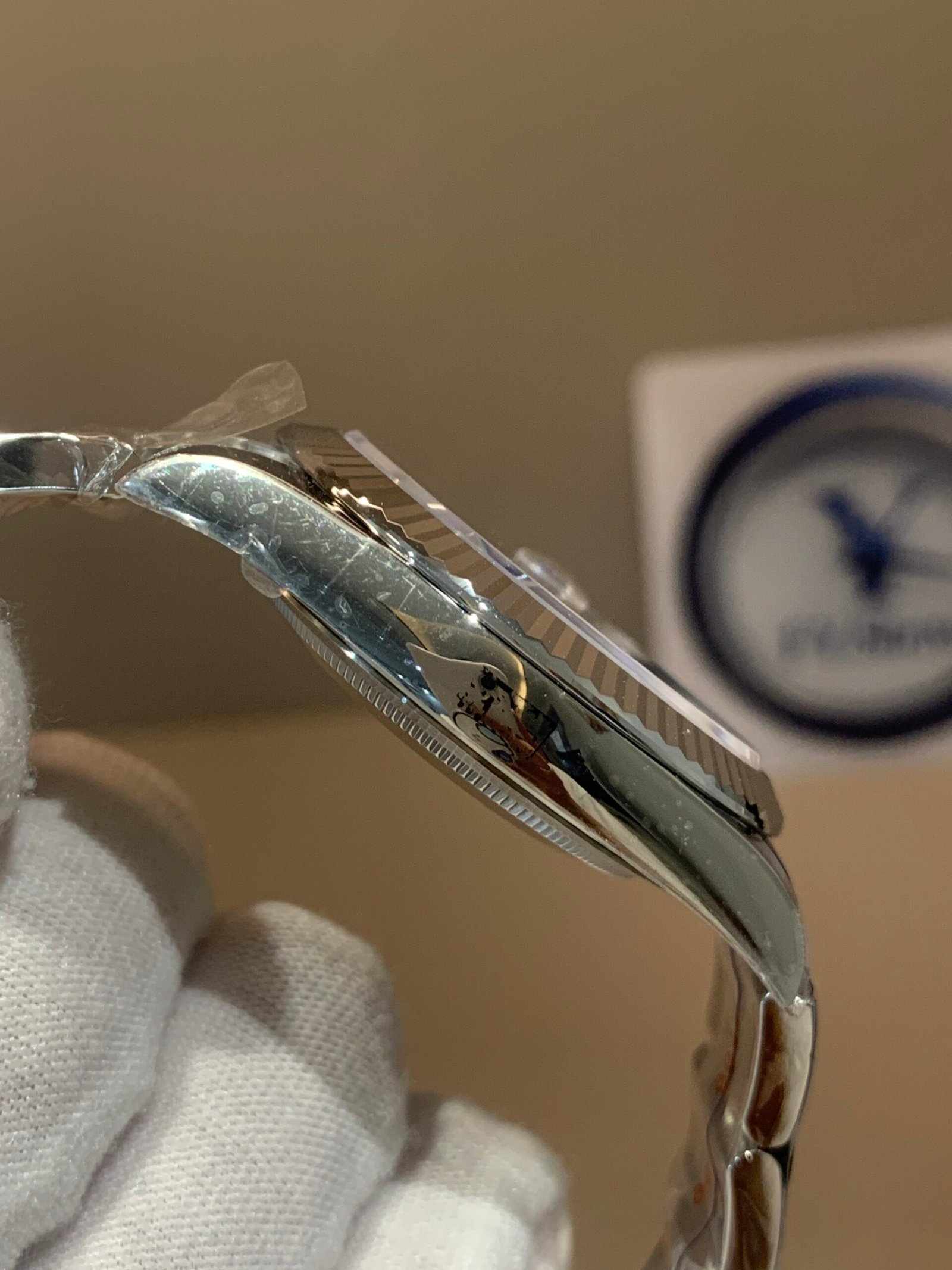 A hallmark of Datejust elegance—VSF’s white gold fluted bezel is meticulously crafted with sharp, even grooves that catch light beautifully. The polished finish matches the genuine’s luxurious appearance, distinguishing it from inferior steel-only replicas.