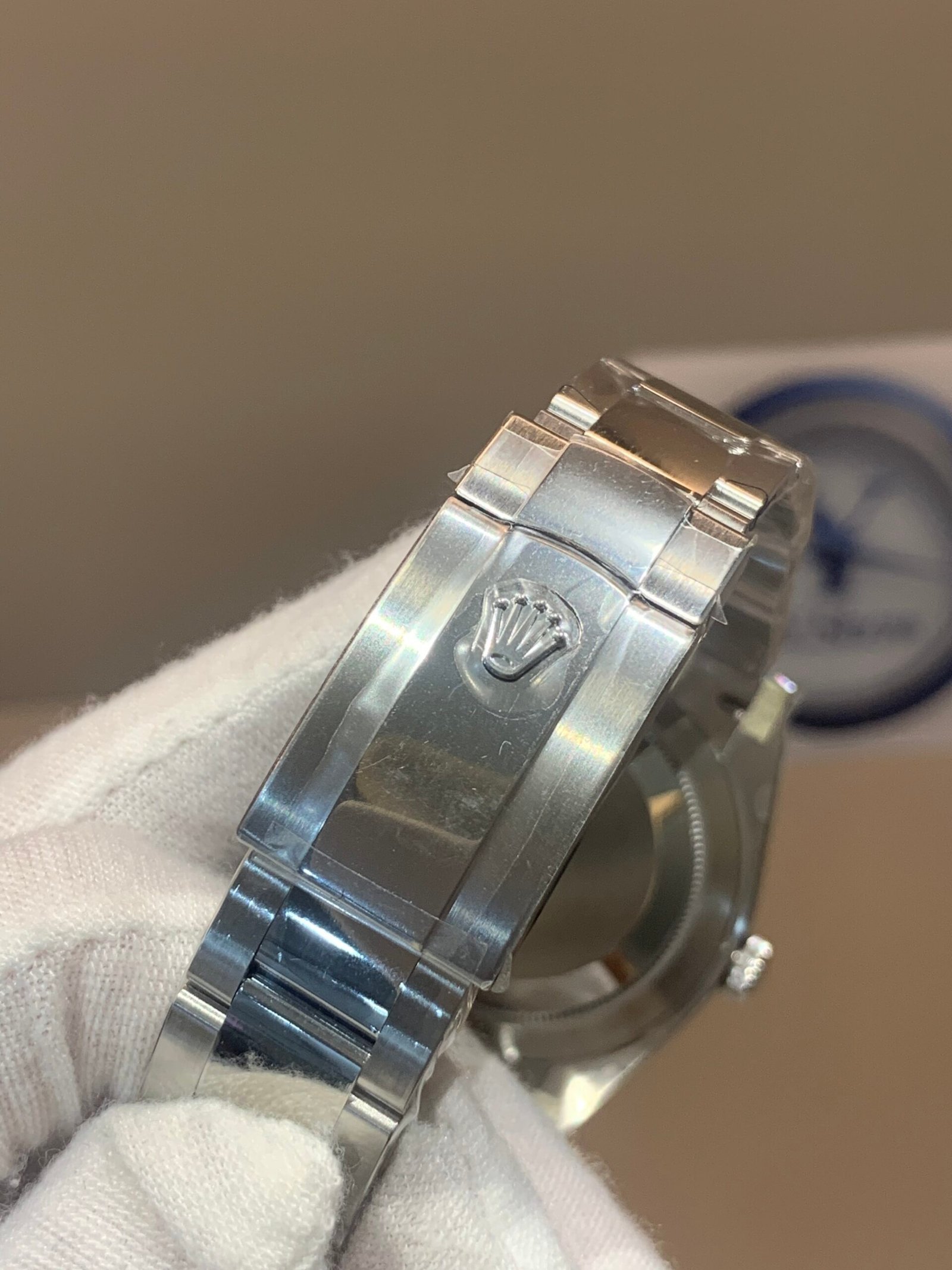 VSF’s sapphire crystal is optically identical to Rolex’s—no milky white edge effect, correct internal AR coating, and a seamless Cyclops lens that magnifies the date by 2.5x without distortion. The blue sunburst dial’s gradient and diamond settings are executed with precision that outshines all other factories.
