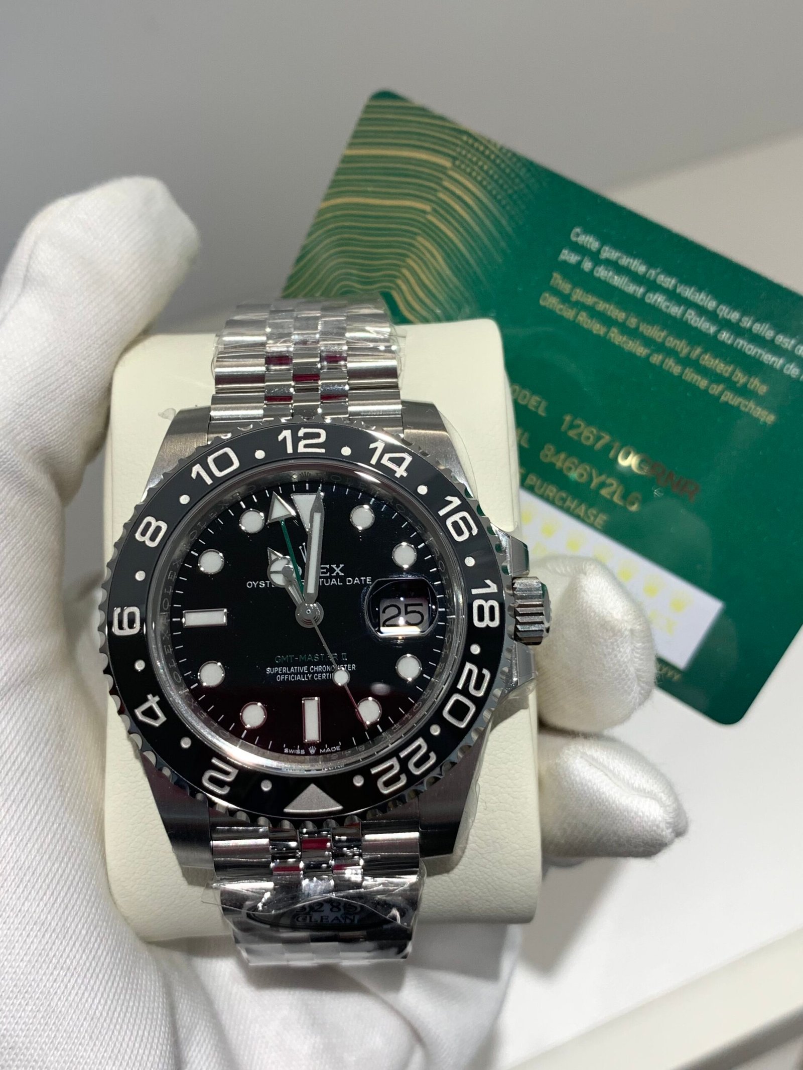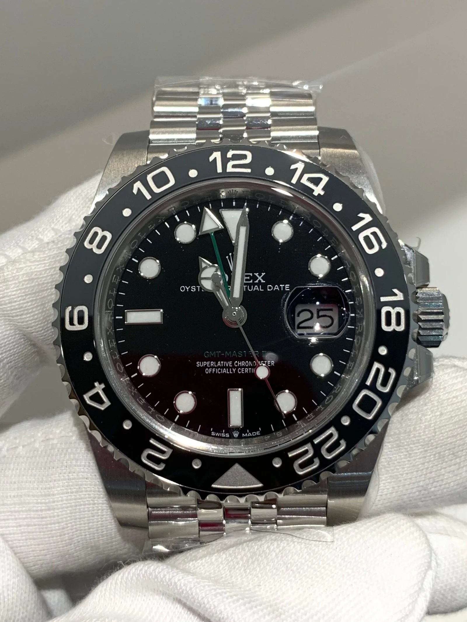 Crisp black dial with clear white gold applied markers. The GMT hand and indices feature strong Chromalight lume. All text, fonts, and spacing are executed to genuine spec.