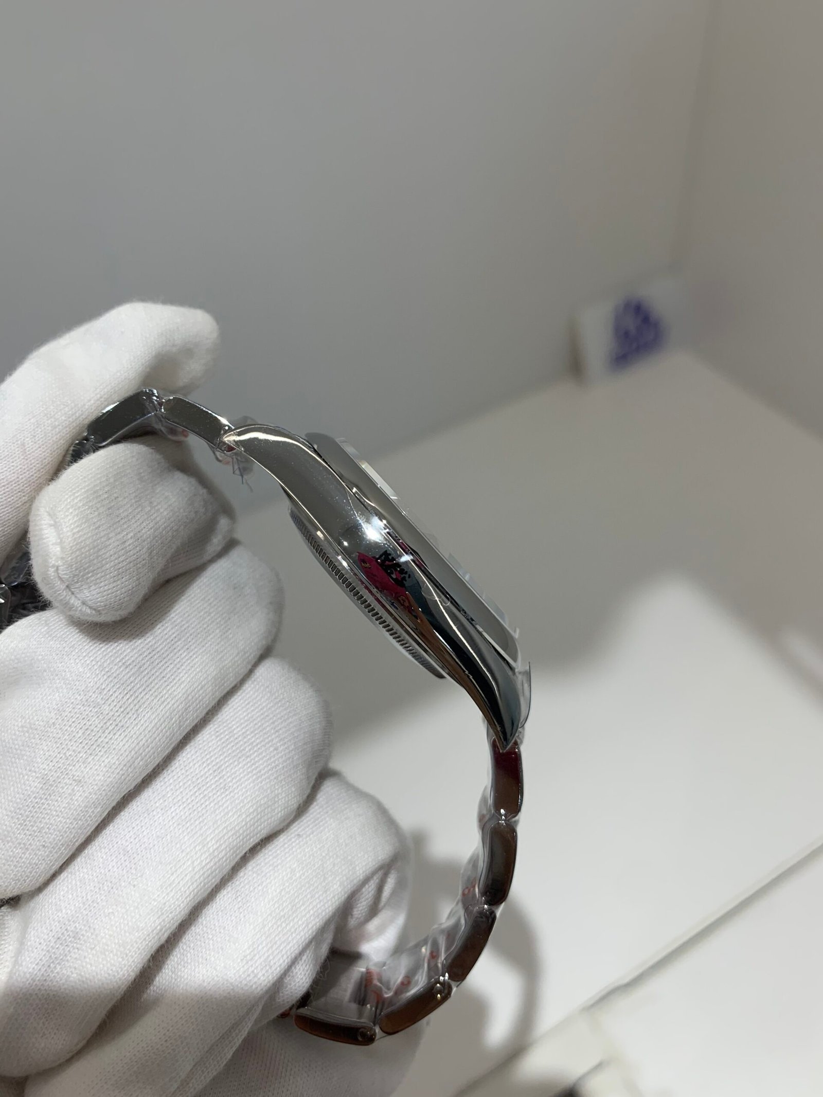 A classic smooth domed bezel, perfectly polished to a mirror shine. It frames the dial without distraction and maintains the correct curvature relative to the mid-case.