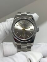 Polished Domed SteelA classic smooth domed bezel, perfectly polished to a mirror shine. It frames the silver-white dial without distraction and maintains the correct curvature relative to the mid-case, echoing the Oyster Perpetual’s timeless design.
