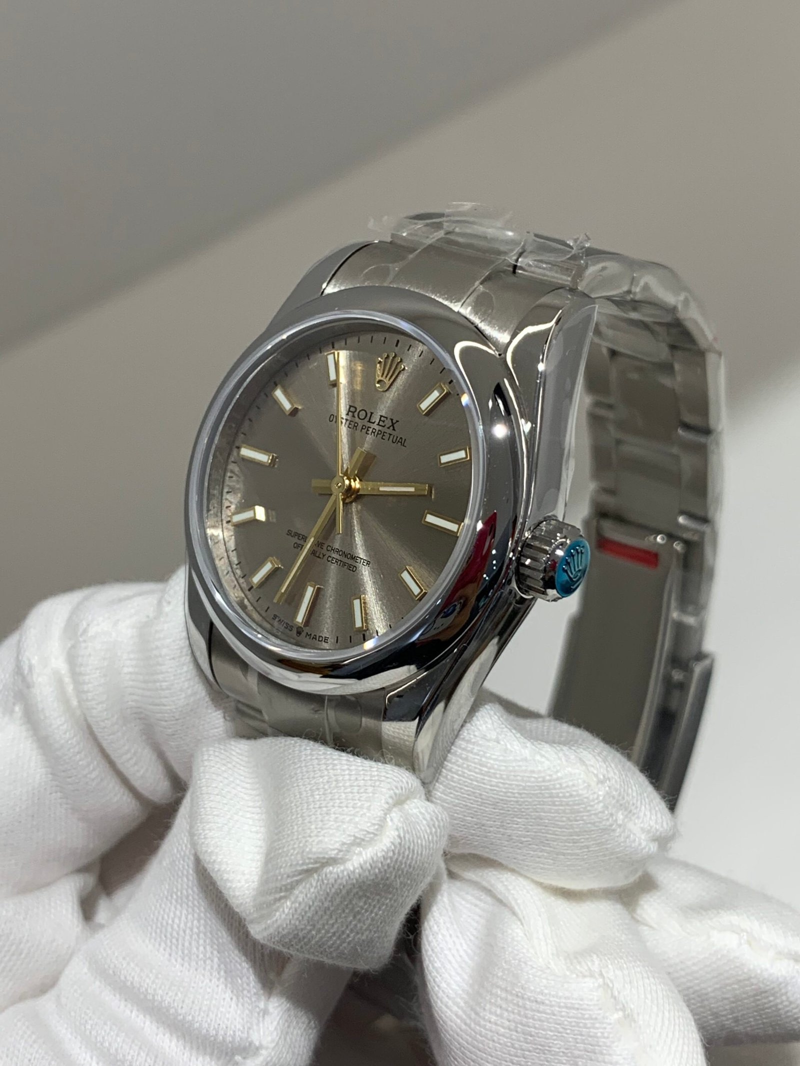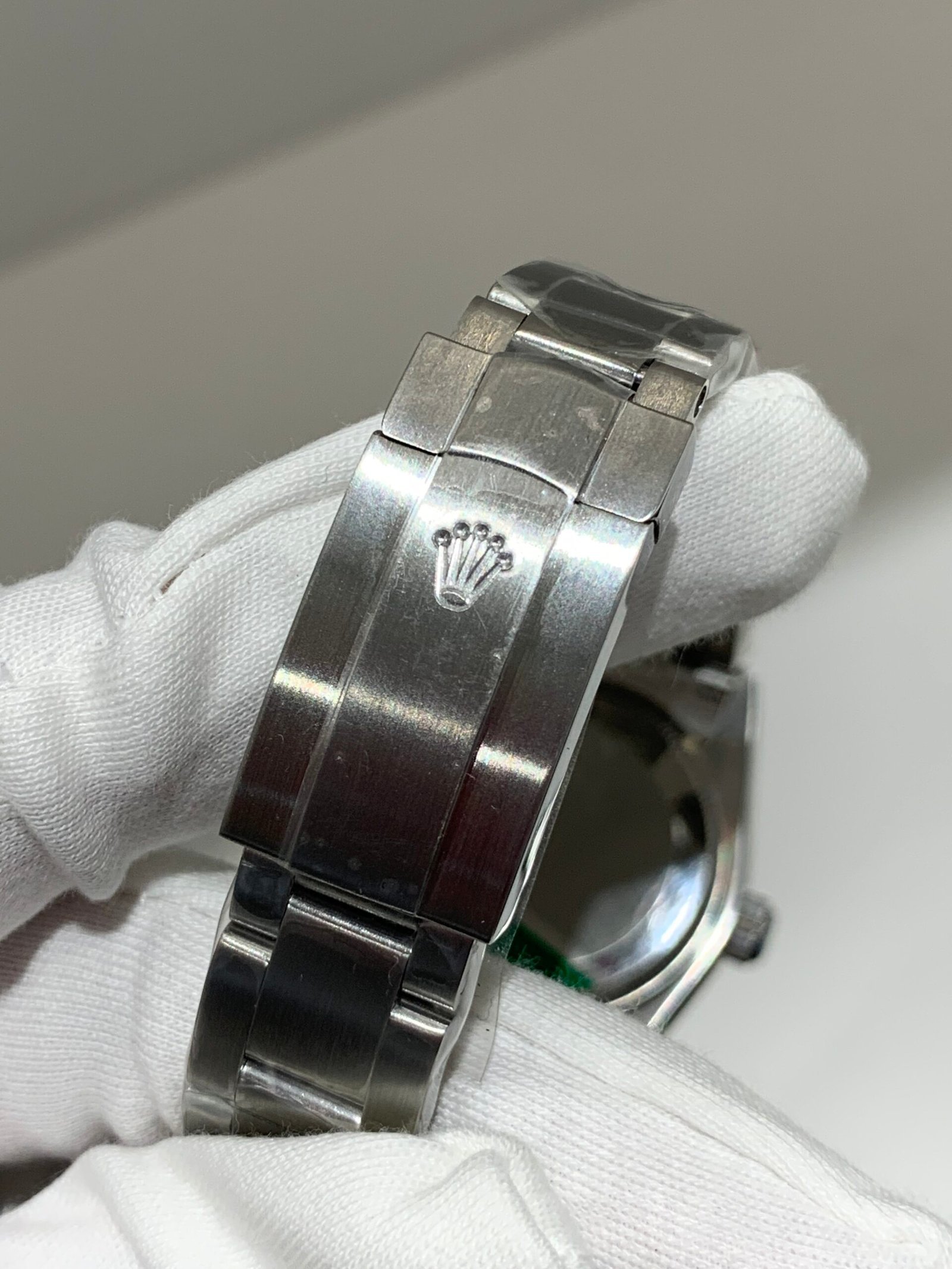 904L Oystersteel FinishVSF continues its dominance in case machining. The 904L stainless steel features industry-leading brushing on the lugs and a buttery smooth bracelet taper that feels identical to the genuine article on the wrist, embodying the Oyster Perpetual’s iconic durability and comfort.