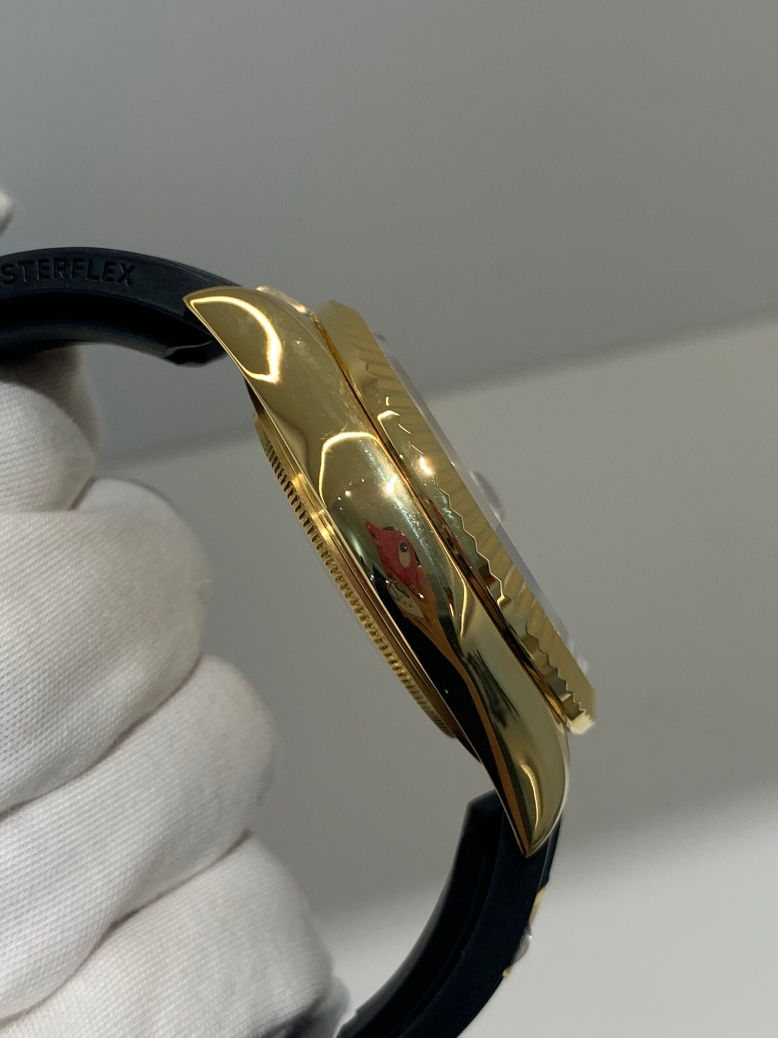 Polished 18K Everose Gold Fluted Bezel A functional fluted Ring Command bezel, perfectly polished to a mirror shine—iconic to the SKY-DWELLER series. It frames the champagne gold dial without distraction, maintains the correct curvature relative to the mid-case, and enables smooth adjustment of dual time zone functions like the genuine.