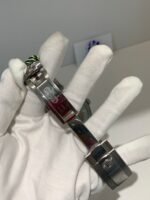The smoke-gray sunburst dial delivers deep, moody radiance under light. Diamond hour markers are crisply set, contrasting elegantly with black sub-dials. Printing is sharp, with the iconic red DAYTONA logo at 6 o’clock.